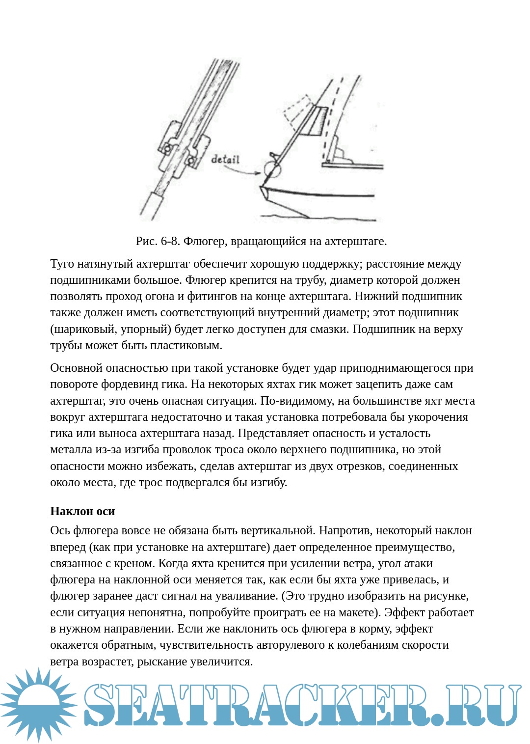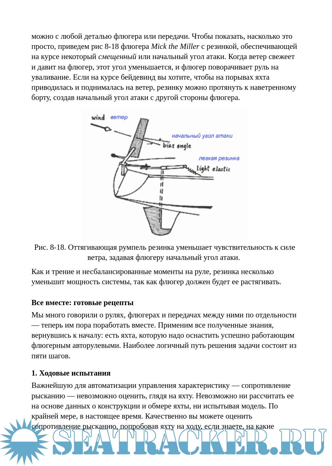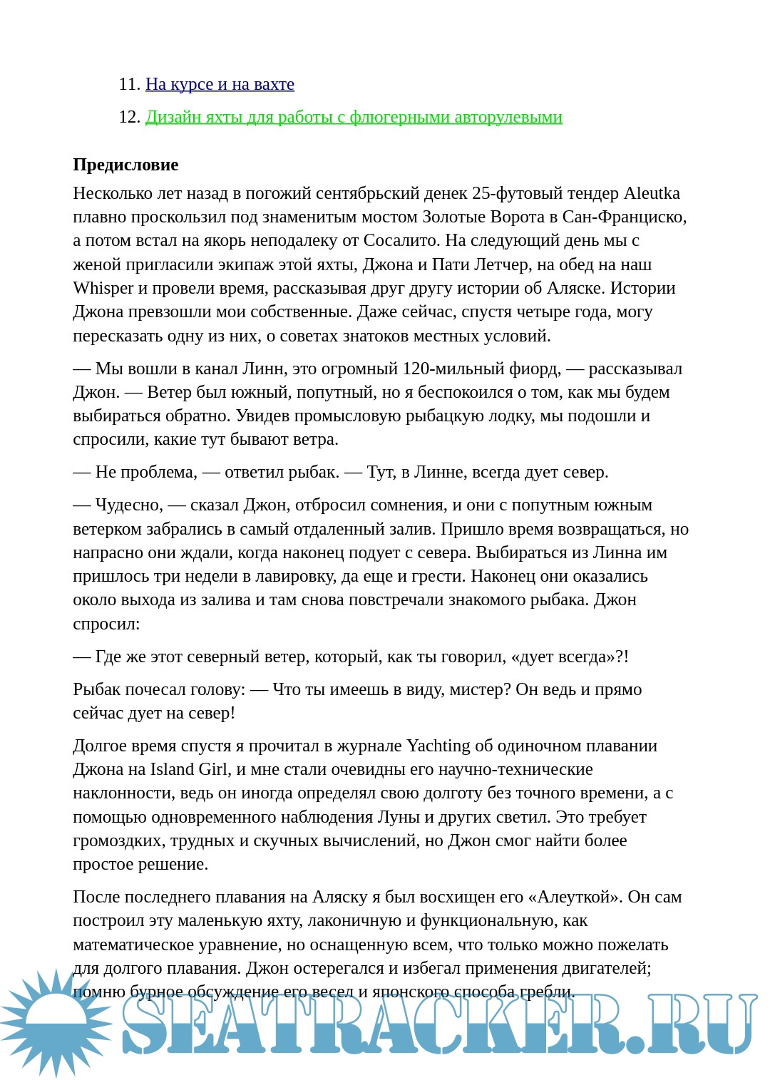 Составляющие основное содержание книги главы 4-9 более специфичны: в них детально рассматриваются системы флюгерных (ветровых) авторулевых и различные аспекты их проектирования, настройки, эксплуатации. Тому, кто собирается в большое плавание по синей воде и интересуется подобными устройствами, книга сбережет силы и время при самостоятельном изготовлении, а если будет приобретен готовый агрегат — поможет в понимании его работы.