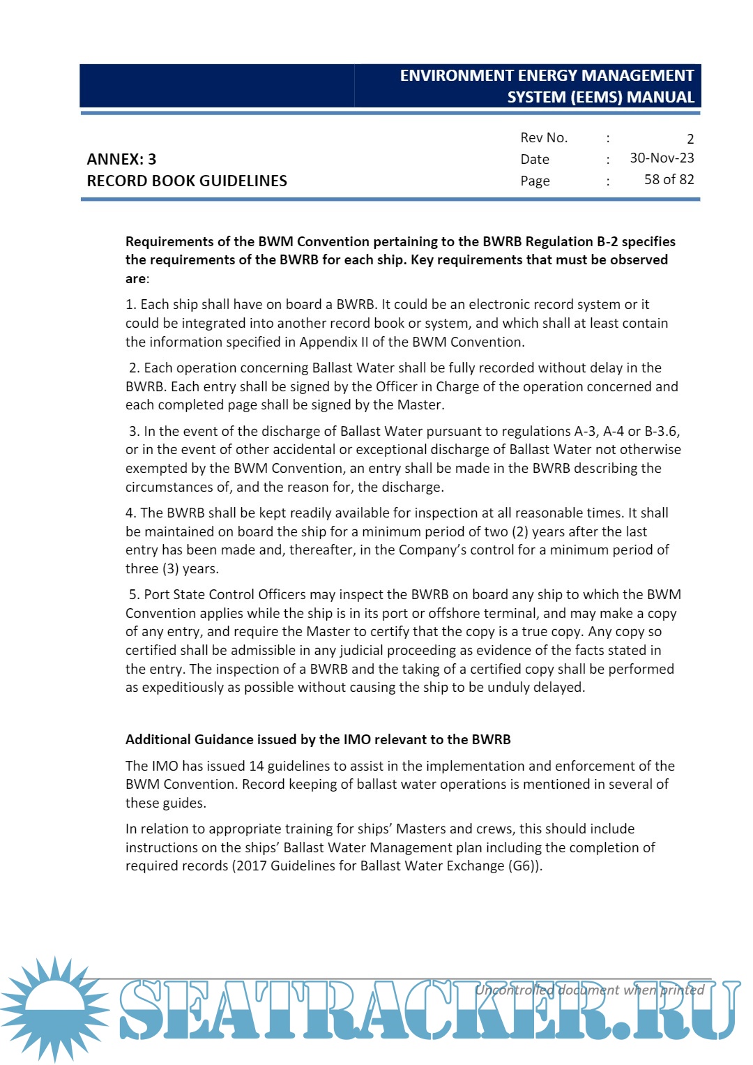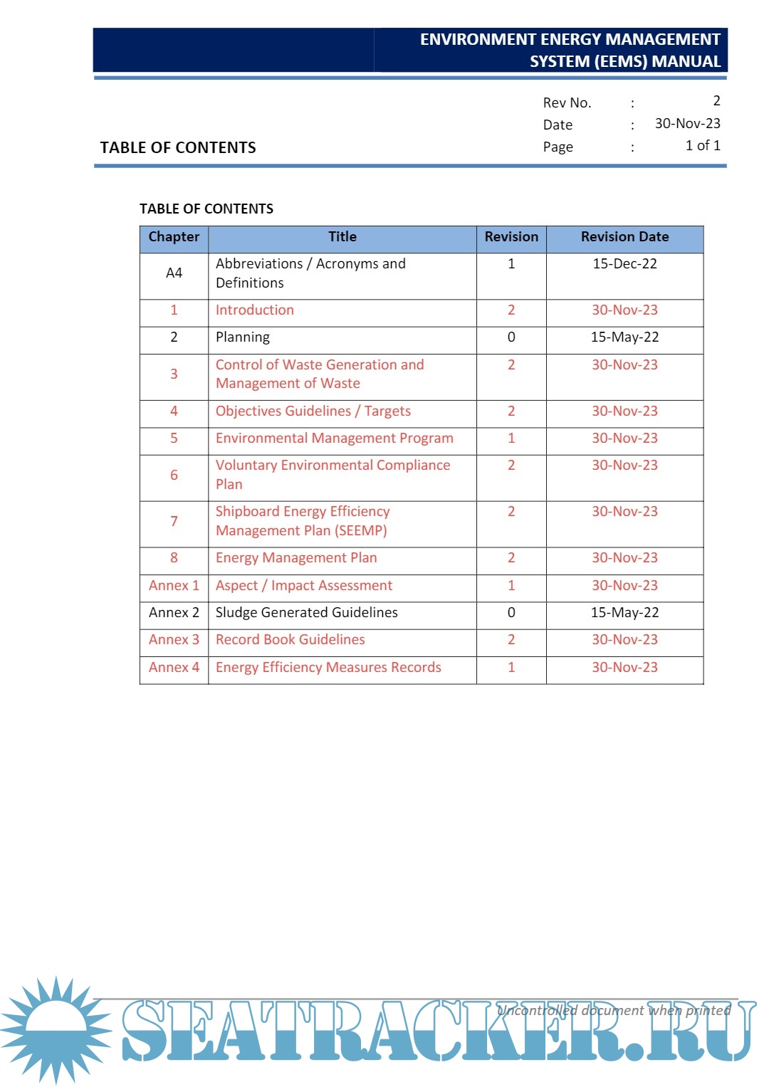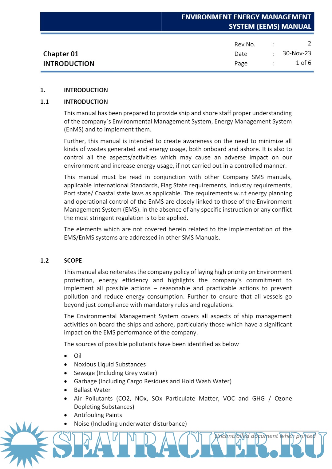 Description: This manual has been prepared to provide ship and shore staff proper understanding of the company`s Environmental Management System, Energy Management System (EnMS) and to implement them.Further, this manual is intended to create awareness on the need to minimize all kinds of wastes generated and energy usage, both onboard and ashore. It is also to control all the aspects/activities which may cause an adverse impact on our environment and increase energy usage, if not carried out in a controlled manner.