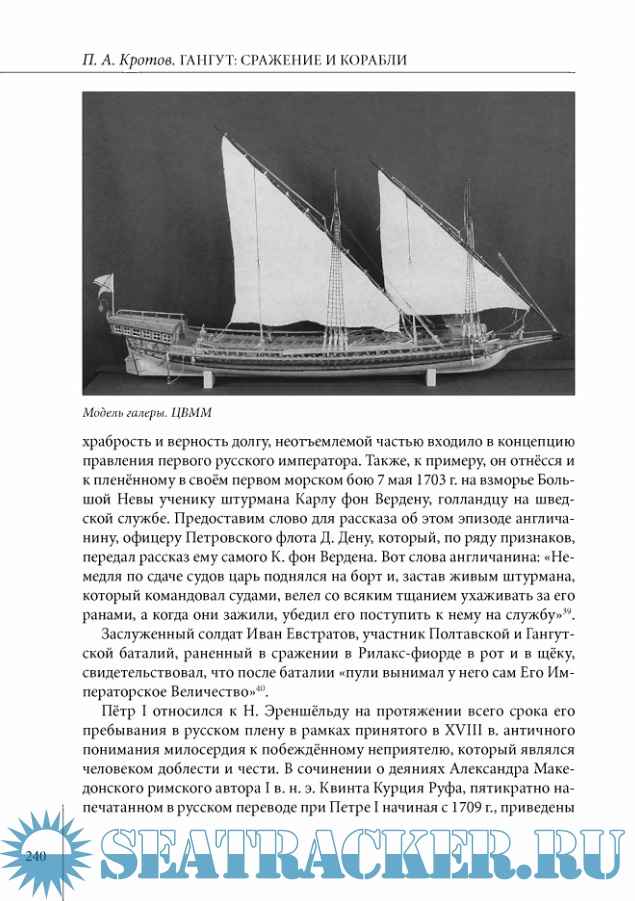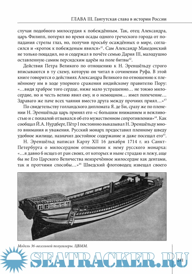Русские и шведы готовятся к сражению: состав шведского шхерного отряда Н. Эреншёльда, место баталии, артиллерийское вооружение кораблей, численность противников, распределение сил россиянами (139). «Благородный вымысел» в описании баталии Н. Эреншёльда (167). Сражение при Гангуте в изложении Й.А. Нурдберга (1740): литературные героико-эпические мотивы (170). Переговоры со шведами о сдаче без боя (173). Начало сражения: артиллерия вступает в дело (174). Отразили ли шведы две атаки россиян? (181) Проход русских галер в тыл шведам (182). Тактика русского галерного флота в баталии (185). Флотоводческое искусство Петра I (186). Потери сторон (188). Участники баталии (193). Награды (201). Последствия сражения при Гангуте в кампанию 1714 г. (206). Значение сражения при Гангуте в Великой Северной войне (211) флота (251). Корабли Российского флота, названные в честь победы, — традиции продолжаются (266). Памятники во славу морской виктории (273).