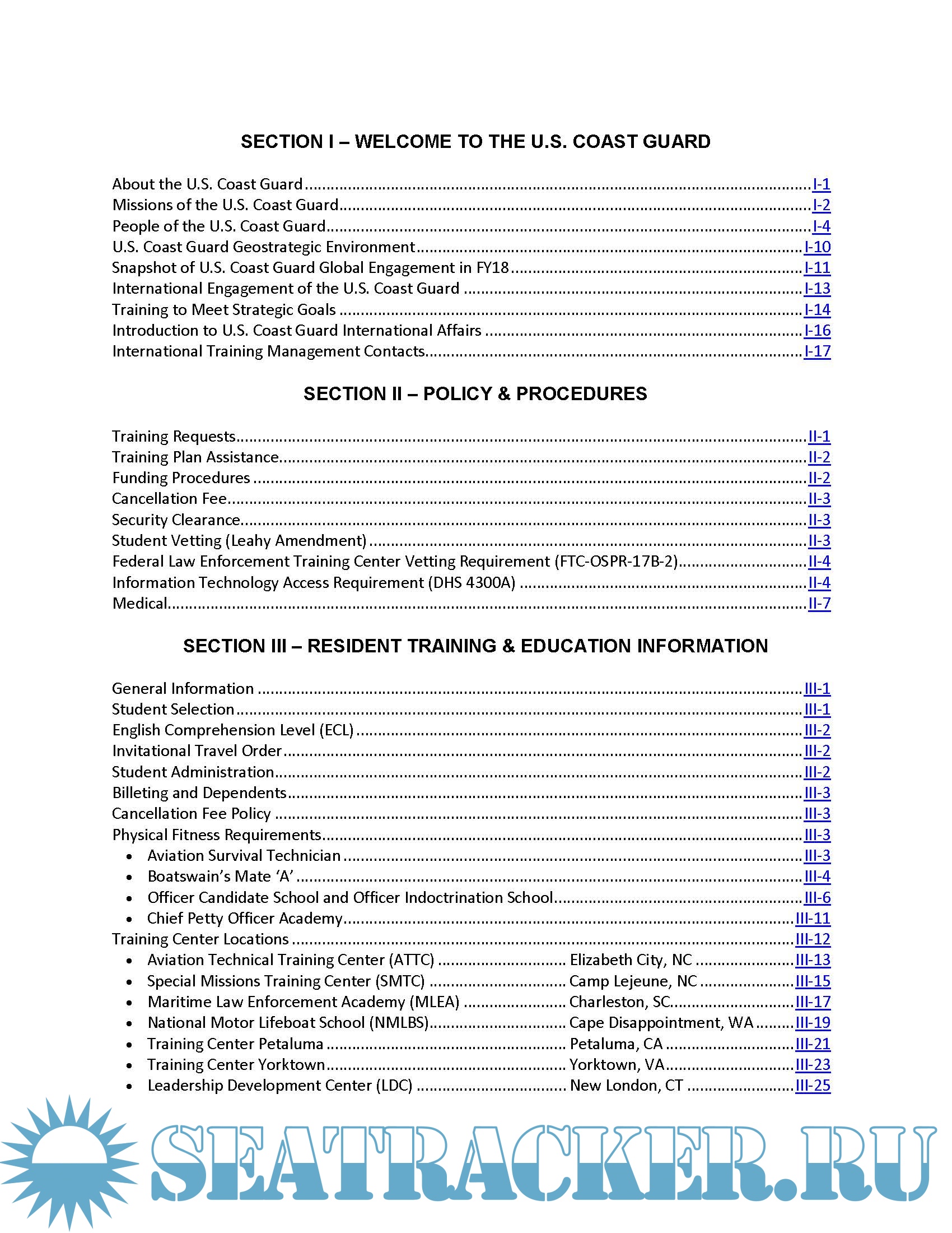 Year: 2019 Language: English Author: U.S. Coast Guard Genre: Handbook Edition: 16 Format: PDF Quality: eBook Pages count: 184 Description: Under the Department of Homeland Security, the U.S. Coast Guard (USCG) is at all times an armed force—a full time military, multi-mission, maritime organization with a true peacetime mission. The USCG work force of 91,000 active duty, auxiliary, reserve, and civilian personnel and more than 2200 vessels and aircraft and 1200 shore locations makes it the world’s greatest coast guard. Structured to meet the diverse missions assigned, the command and control network allows decentralized responsibility and authority. Primary organizational elements include USCG Headquarters; two area commands; nine district commands; thirty five sectors; and field and headquarters units such as training centers. Committed to its reputation as a multifaceted organization with its distinctive blend of military, humanitarian, maritime safety and security, and civilian law-enforcement capabilities, the USCG has a vital international role in support of regional and national security strategies. The USCG provides assistance and training for which the USCG is “especially qualified” to citizens of other countries. This assistance is provided under the authority of 14 USC 141(a) and the Economy Act 31 USC 1535, which requires reimbursement from the assisted federal agencies. The Foreign Assistance Act of 1961, as amended in sec 545 (22 USC 2347d) specifically authorizes training in maritime skills under the international military education and training program. Globally recognized as a master in accomplishing each of the duties with which it has been entrusted throughout its 228-year history, the USCG has also been a leader in using limited resources. The USCG’S main mission areas are maritime safety, maritime mobility, maritime security, national defense, and protection of natural resources. These mission areas encompass operations in aids to navigation, national defense and international engagement, pollution prevention and environmental response, ice conditions, maritime law enforcement, marine inspection, marine licensing, marine science activities, port safety and security, search and rescue, and waterways management. These capabilities are in great demand throughout the world. For example, proficiencies used to interdict narcotics or migrants are also recognized in wider application to assist other nations to combat the global threat of terrorism, threats to maritime safety and security or in areas of piracy, trafficking in persons or interdicting weapons of mass destruction. The ability of the USCG to interface successfully with many diverse agencies stands as an example of interagency, interoperability, cooperation and command communication.
