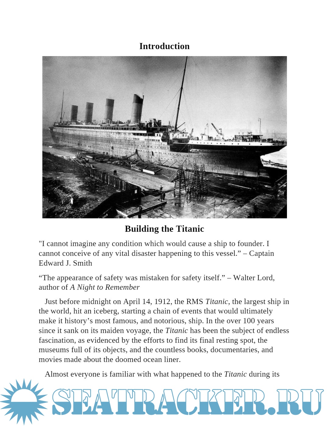 Year: 2014 Language: English Author: Charles River Editors Genre: History Publisher: Charles River Editors Format: PDF Quality: eBook Pages count: 72 Description: Just before midnight on April 14, 1912, the RMS Titanic, the largest ship in the world, hit an iceberg, starting a chain of events that would ultimately make it history’s most famous, and notorious, ship. In the over 100 years since it sank on its maiden voyage, the Titanic has been the subject of endless fascination, as evidenced by the efforts to find its final resting spot, the museums full of its objects, and the countless books, documentaries, and movies made about the doomed ocean liner. The Titanic was neither the first nor last big ship to sink, so it’s clear that much of its appeal stems from the nature of ship itself. Indeed, the Titanic stands out not just for its end but for its beginning, specifically the fact that it was the most luxurious passenger ship ever built at the time. In addition to the time it took to come up with the design, the giant ship took a full three years to build, and no effort or cost was spared to outfit the Titanic in the most lavish ways. Given that the Titanic was over 100 feet tall, nearly 900 feet long, and over 90 feet wide, it’s obvious that those who built her and provided all of its famous amenities had plenty of work to do. The massive ship was carrying thousands of passengers and crew members, each with their own experiences on board, and the various amenities offered among the different classes of passengers ensured that life on some decks of the ship was quite different than life on others. Thanks to the dramatization of the Titanic’s sinking and the undying interest in the story, millions of people are familiar with various aspects of the ship’s demise, and the nearly 1,500 people who died in the North Atlantic in the early morning hours of April 15, 1912. The sinking of the ship is still nearly as controversial now as it was over 100 years ago, and the drama is just as compelling. However, while the sinking of the Titanic will always be a compelling story, the construction of the Titanic is often overlooked, despite being an amazing story itself, and one that combined both comfort and raw power with the world’s foremost technological advances. Building the RMS Titanic examines the history behind the origins of the ship, the construction of the boat, and a look at the rooms and amenities it held. Along with pictures of important people, places, and events, you will learn about the construction of the Titanic like never before, in no time at all. Additional info: About the author: Charles River Editors is a digital publishing company that creates compelling, educational content. In addition to publishing original titles, we help clients create traditional and media-enhanced books.