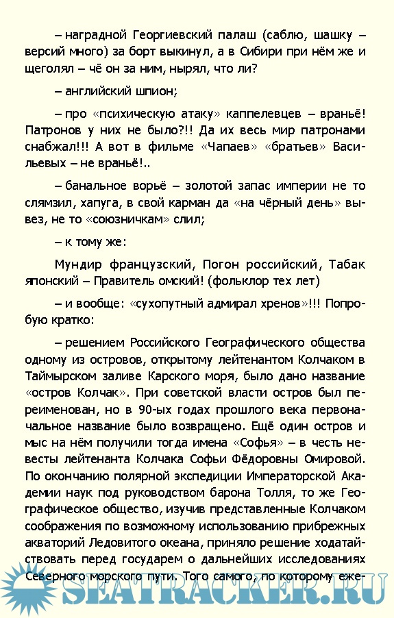 Описание: С точки зрения советской истории нет, пожалуй, в Белом движении фигуры более зловещей, чем фигура адмирала Колчака. Обвинений к нему множество и они столько лет звучали, что на слух воспринимаются, как нечто само собой разумеющееся, не требующее ни дополнительных доказательств, ни уж тем более опровержений. Ведь он английский шпион, правда? Укравший золотой запас империи, где-то потаённо ждущий своих наследников. Или давно потраченный и уж точно не на благое дело. Да и странный адмирал какой-то, о флотских подвигах которого ничего никому неизвестно, а вот о зверствах колчаковщины в Сибири и на Урале известно всем! А как он Сибирскую республику в крови потопил? Ну, не большевицкую, но ведь потопил же! То то!.. Он же во Владивосток аж из Америки приехал. Да в сопровождении высшего английского офицера. Пройдя кровавой дорогой до самой Уфы с сибирскими, а особенно амурскими казаками атамана Семёнова, творившими такое, что кровь стыла в жилах и при Колчаке, и после уж казни его, при отступлении семеновцев обратно в Приморье. Рабочих уральских заводов Колчак под угрозой смерти в бой гнал, а заводы стояли все. А снабжения своего белогвардейского фронта исключительно взятием в заложники семей паровозных бригад добился!