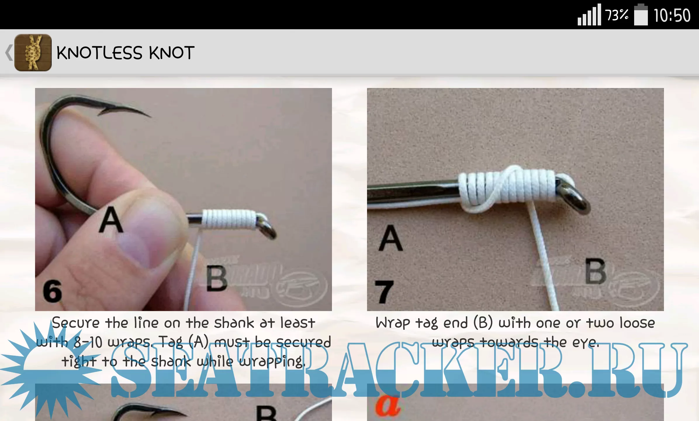 This application illustrates how to make the most popular fishing knots, categorized in 4 chapters: line, hook, misc and boating knots. Step-by-step instructions help anyone to master those.