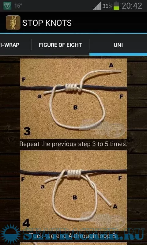 • Stop knots: Multi-wrap stop knot, Figure of eight stop knot, Uni stop knot