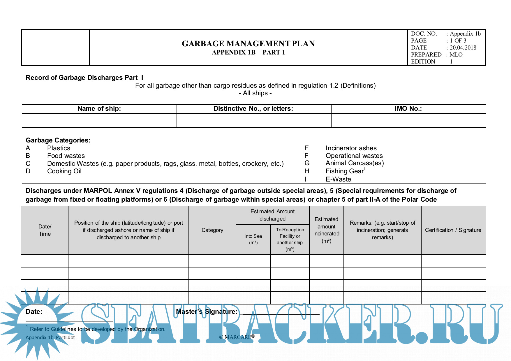 1b) Record of Garbage Discharges Part I and II