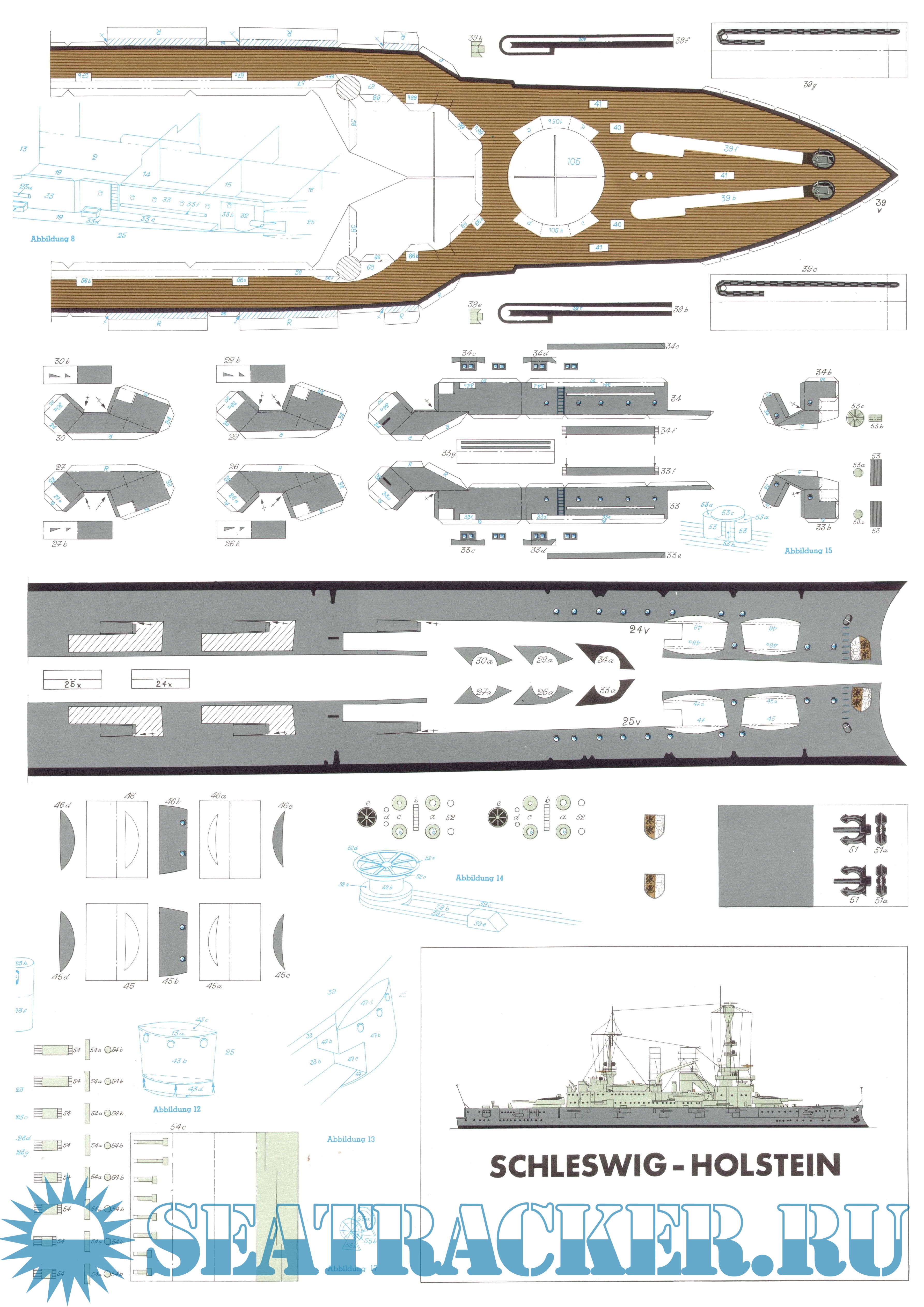 8 листов цветных выкроек для изготовления броненосцев типа Schleswig-Holstein (Германия)
