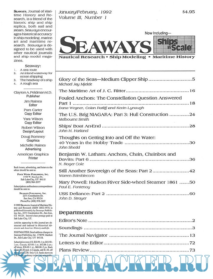 Year: 1992 Language: English Author: Scottie Dayton (Editor) Genre: Periodical (magazine) Edition: 1992-1 Format: PDF Quality: eBook Pages count: 76 Description: Seaway is the home port for Seaways Ships in Scale magazine, the leading workshop and research magazine for the ship modeler. In the magazine we explore all levels of modeling experience, all types of ships, all kinds of models, all historical eras and all construction materials