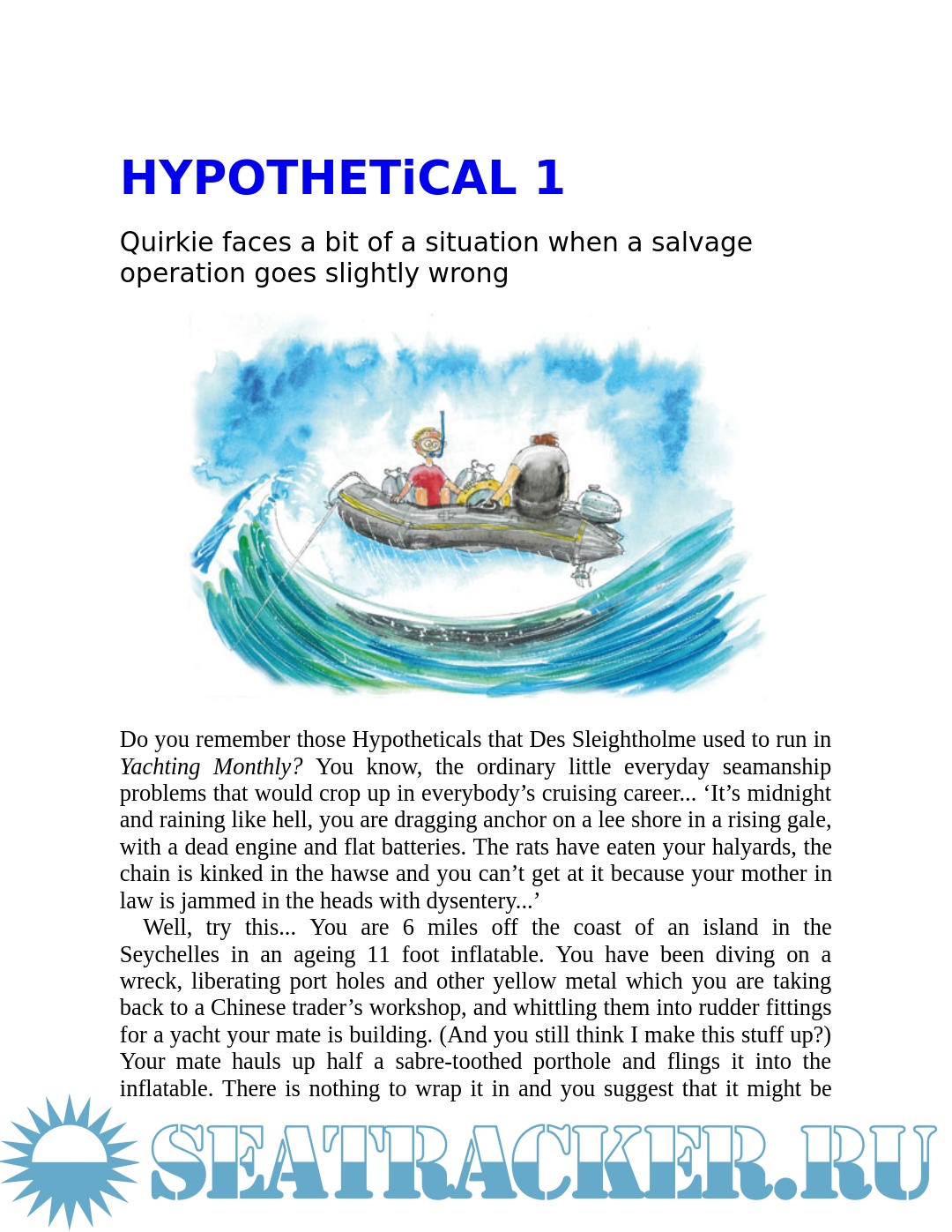 Year: 2013 Language: English Author: Quirk J. Genre: Manual Publisher: A&c Black Format: PDF/EPUB Quality: eBook Pages count: 160 Description: Based on a series of highly popular articles written for Classic Boat magazine, this witty collection dwells on the scrapes people get themselves into when building and sailing boats of all descriptions. Most sailors will find something to relate to in the escapades and faux pas detailed here, and the stories will undoubtedly bring a wry smile to any boater's lips. John Quirk's terrifically witty cartoons help bring these anecdotes to life.