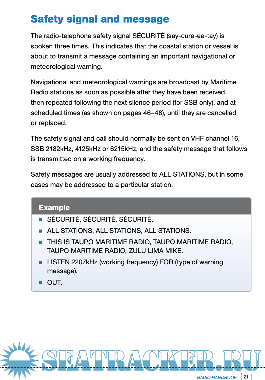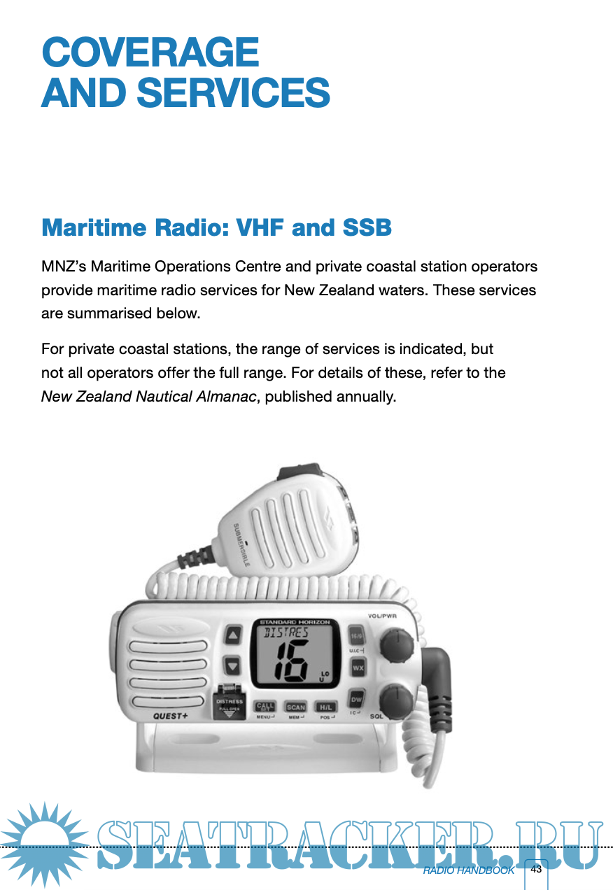 Year: 2023 Language: English Author: Maritime New Zealand Genre: Handbook Publisher: Maritime New Zealand Edition: 4th ISBN: 0-478-18816-1 Format: PDF Quality: eBook Pages count: 72 Description: This handbook is a guide for operators of coastal and vessel* radio stations, including operators of VHF (very high frequency) and SSB (single sideband, also called MF/HF) radios. It provides information about: how search and rescue is managed in New Zealand distress, urgency and safety calls, including appropriate use of cellphones radio-telephone procedures coverage useful contacts and terms. Additional info: Older version 2016 here: https://seatracker.club/viewtopic.php?t=34480