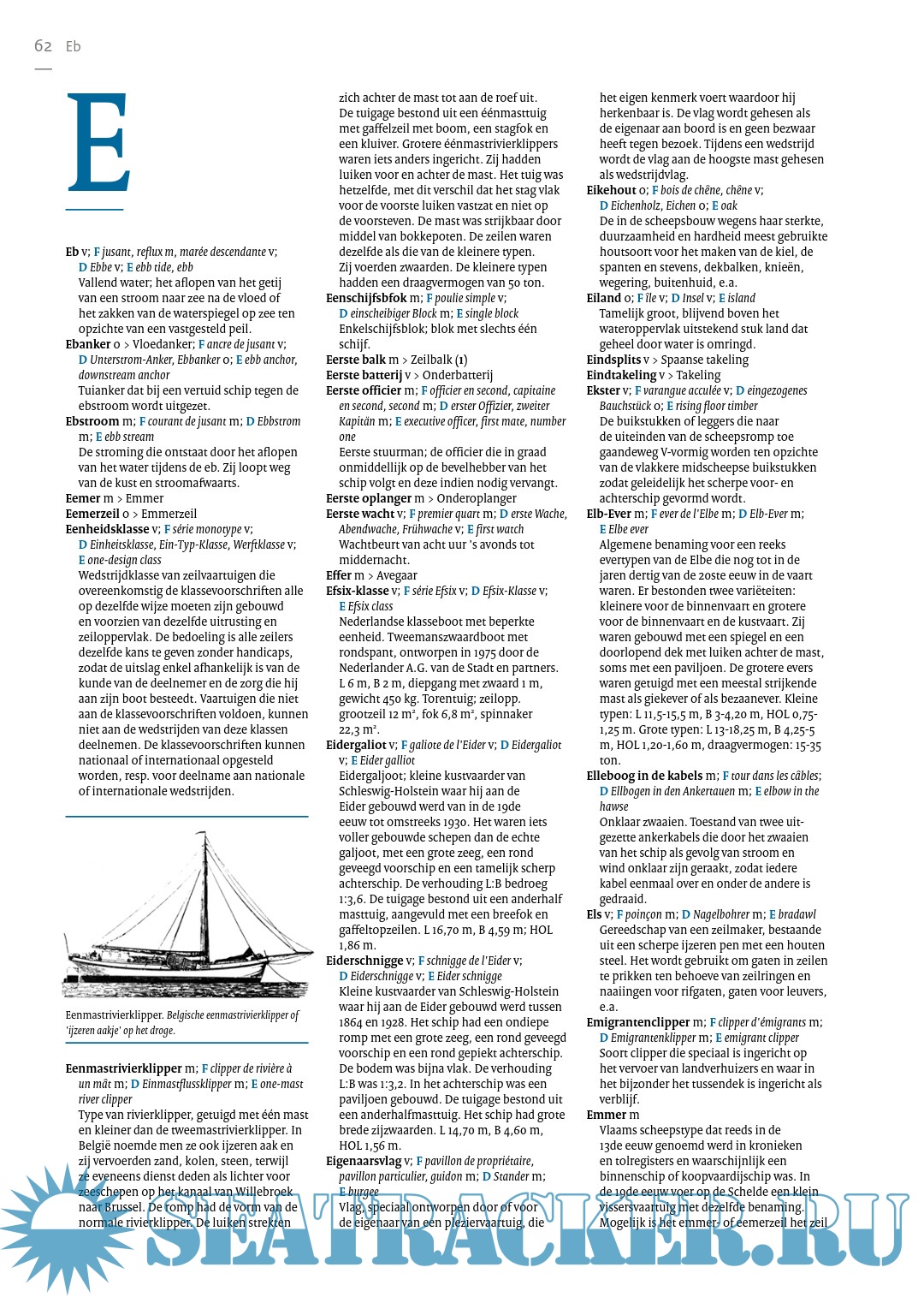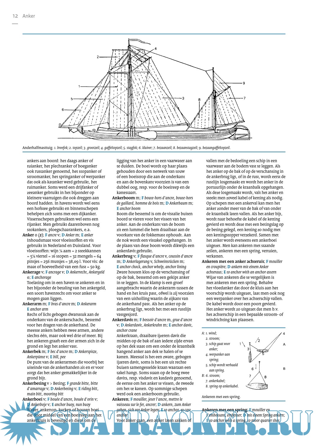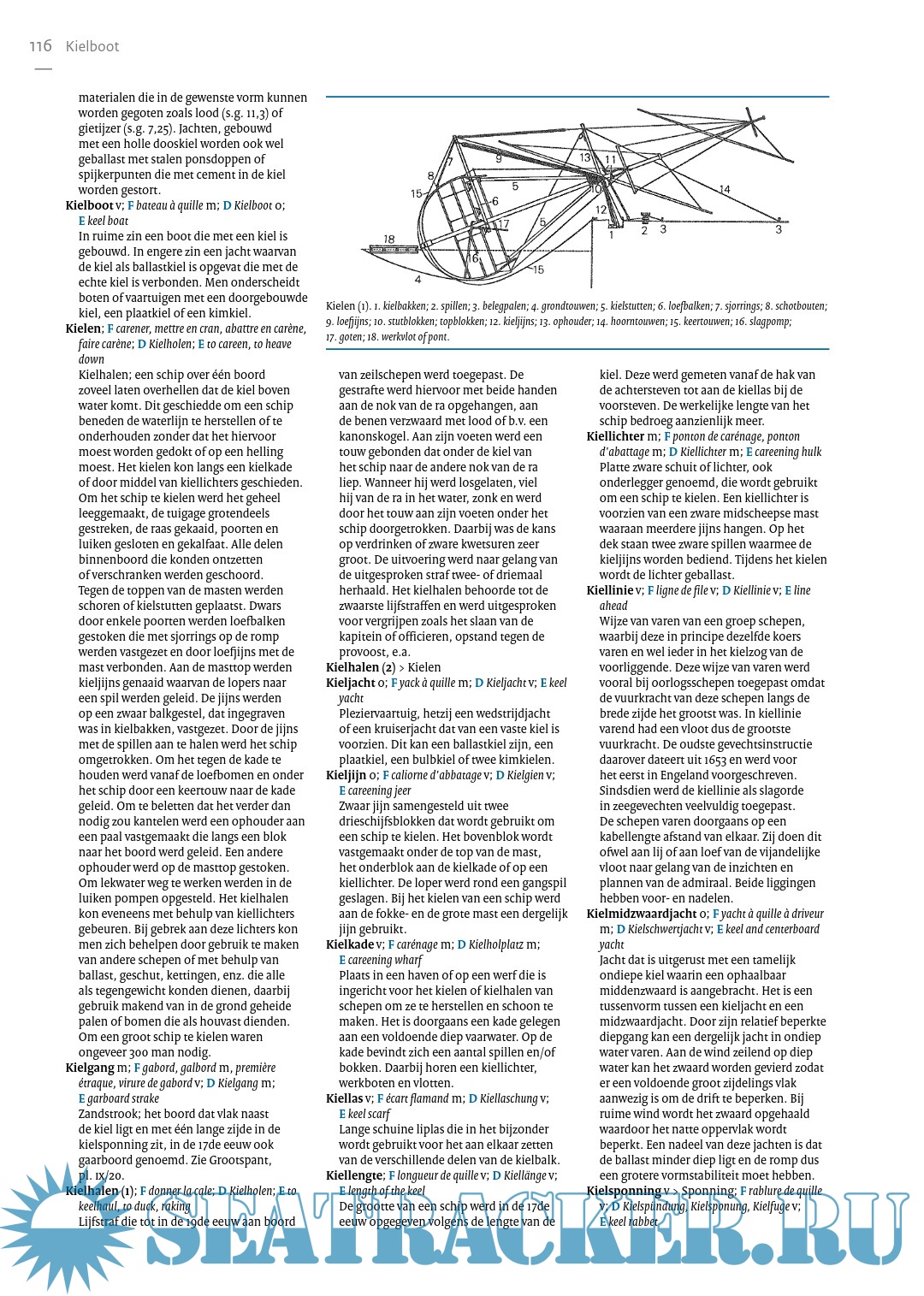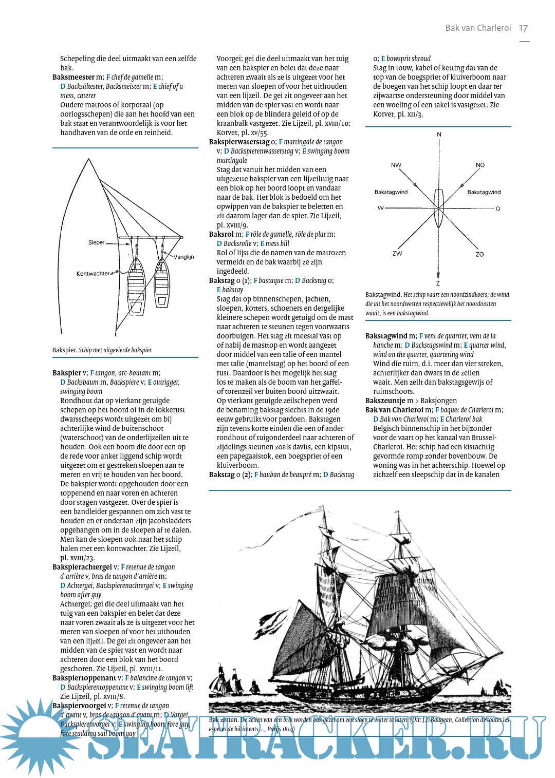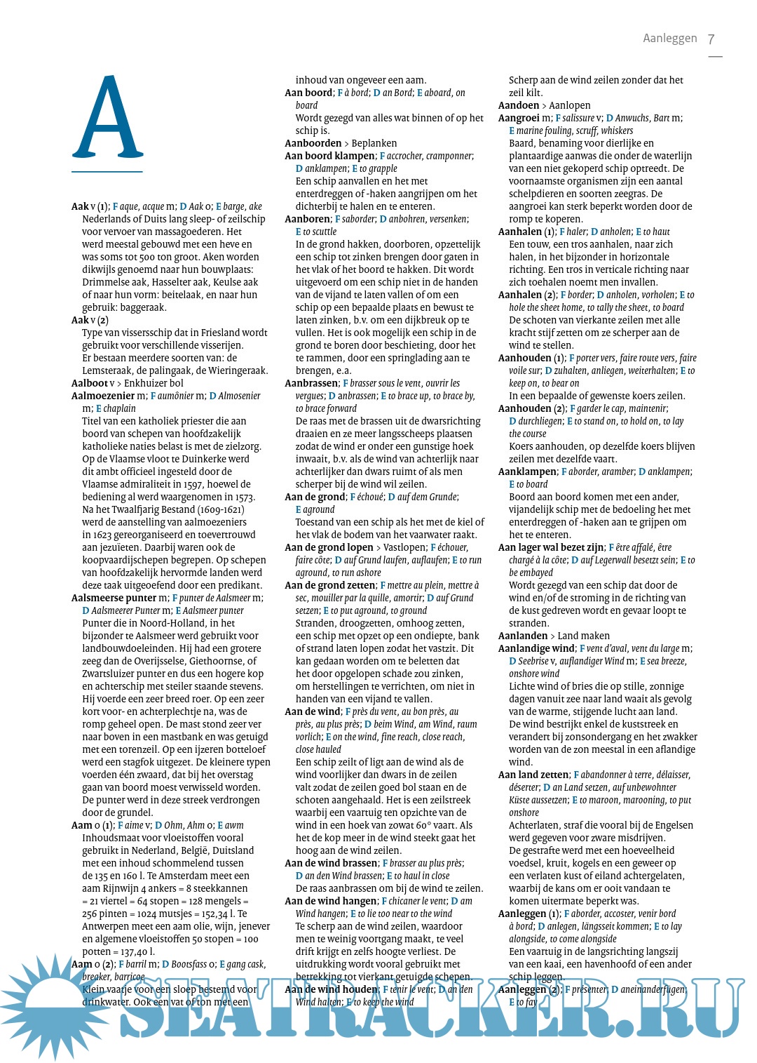 Specialized encyclopedia with approx. 7000 technical terms from shipping in general and sailing in particular. From Aak, Admiral and Anchor cushion to Grootbovenbramlijzeil, Kielhalen, Logboek and Zwolse kaag. Clearly printed in three columns