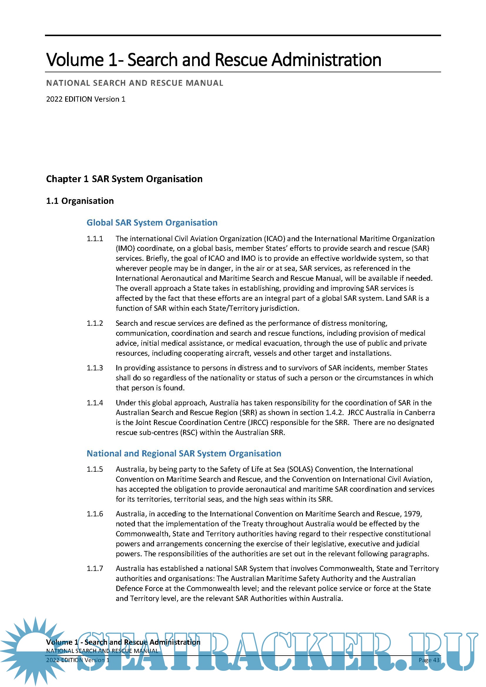 The manual is consistent with the relevant International Conventions to which Australia is a party and is supplemented by various legal, informative and instructional documents used within, and between, organisations concerned with search and rescue. It has been developed with due regard to the International Aviation and Maritime Search and Rescue Manual (IAMSAR).