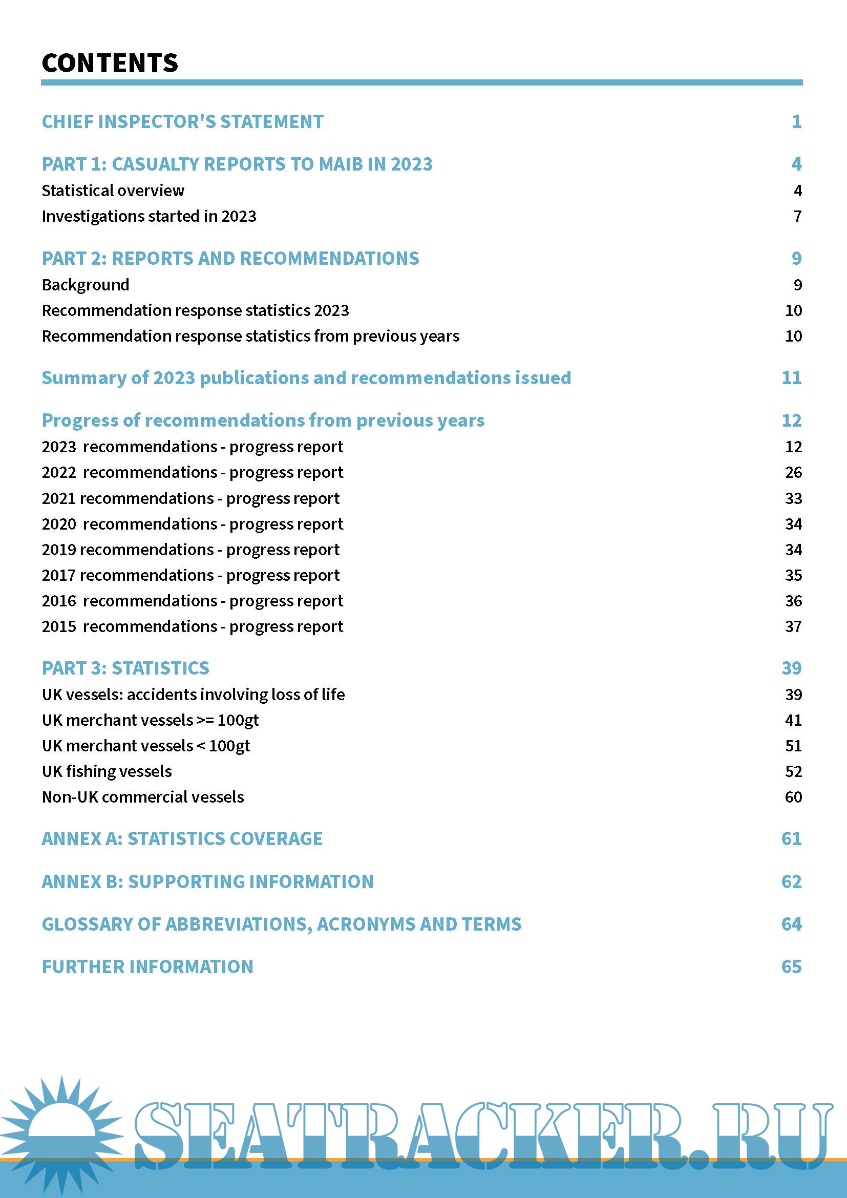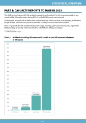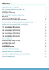 MAIB's annual report for 2023, detailing the Chief Inspector's report for the year, a feature on pilot ladder accidents and incidents, investigations started, reports publications, recommendation made and statistical information for accidents reported to MAIB. The Marine Accident Investigation Branch (MAIB) examines and investigates all types of marine accidents to or on board UK vessels worldwide, and other vessels in UK territorial waters.