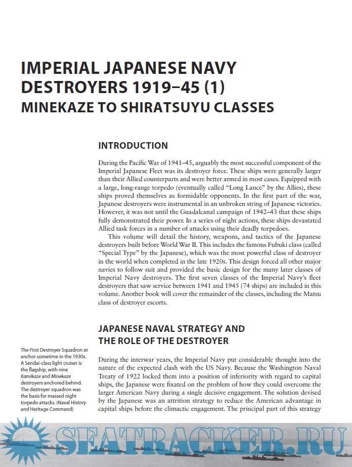 This volume will detail the history, weapons and tactics of the Japanese destroyers built before the war. This includes the famous Fubuki class (called "Special Type" by the Japanese, which were, when completed in the late 1920's, the most powerful class of destroyers in the world. This design forced all other major navies to follow suite and provided the basic design for the next many classes of Imperial Navy destroyers. This book will also cover the three classes built before the Special Type which were based on a German World War I design as well as two classes built after the advent of the Special Type. All of these ships had a rich history as they fought from the first battles of the Pacific War up until the very end when several accompanied the superbattleship Yamato on her death sortie.