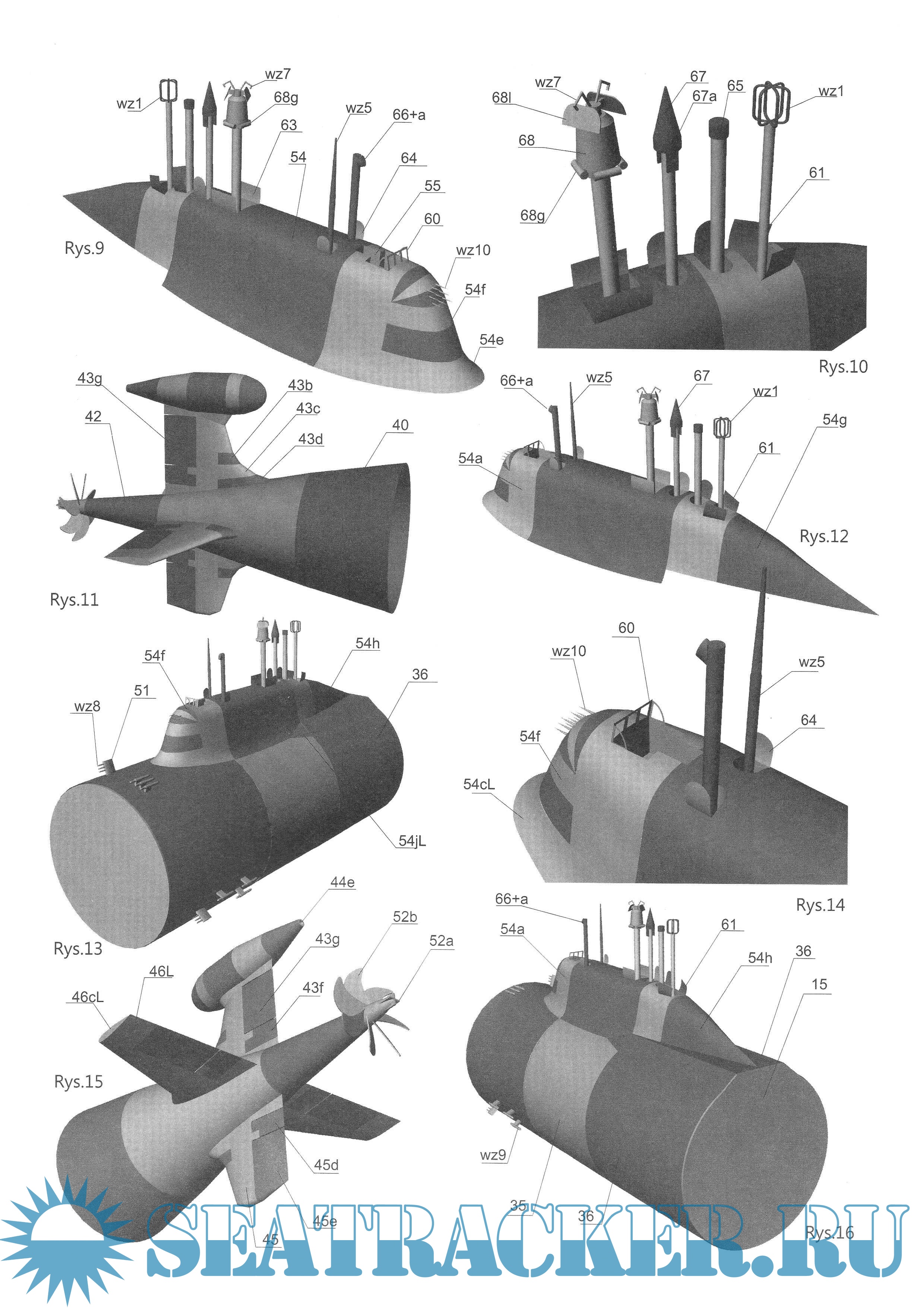 Описание: 13 листов цветных выкроек и инструкций для изготовления бумажной модели подводной лодки проекта 971 АКУЛА