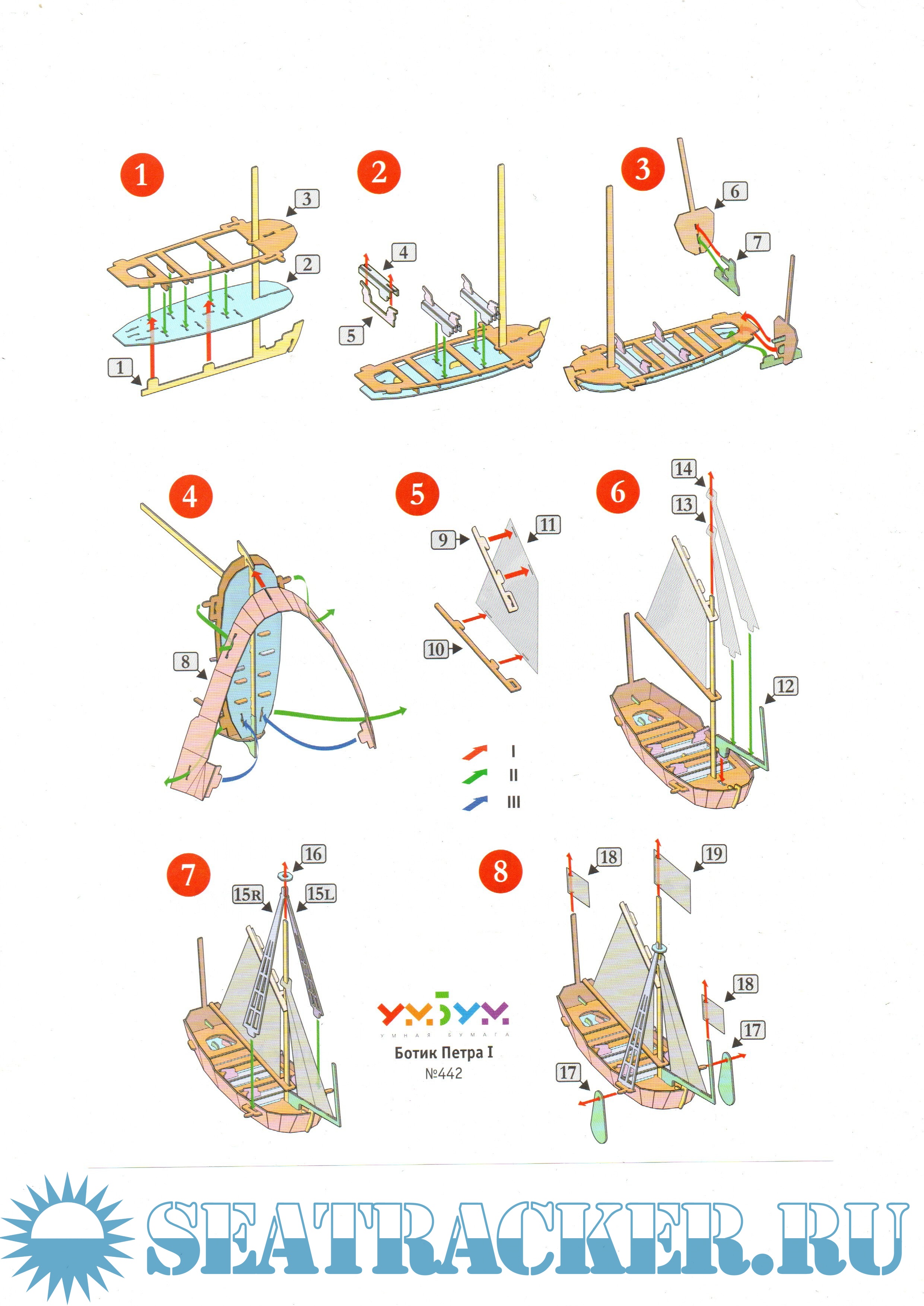 9 листов цветных выкроек и инструкций для изготовления бумажной модели ботика Петра I