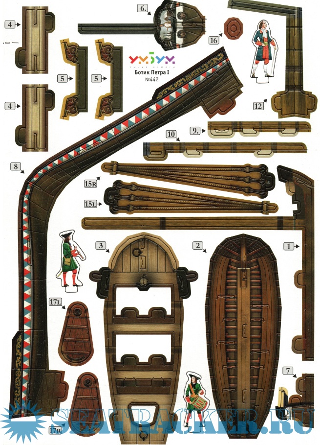 9 листов цветных выкроек и инструкций для изготовления бумажной модели ботика Петра IСкриншоты