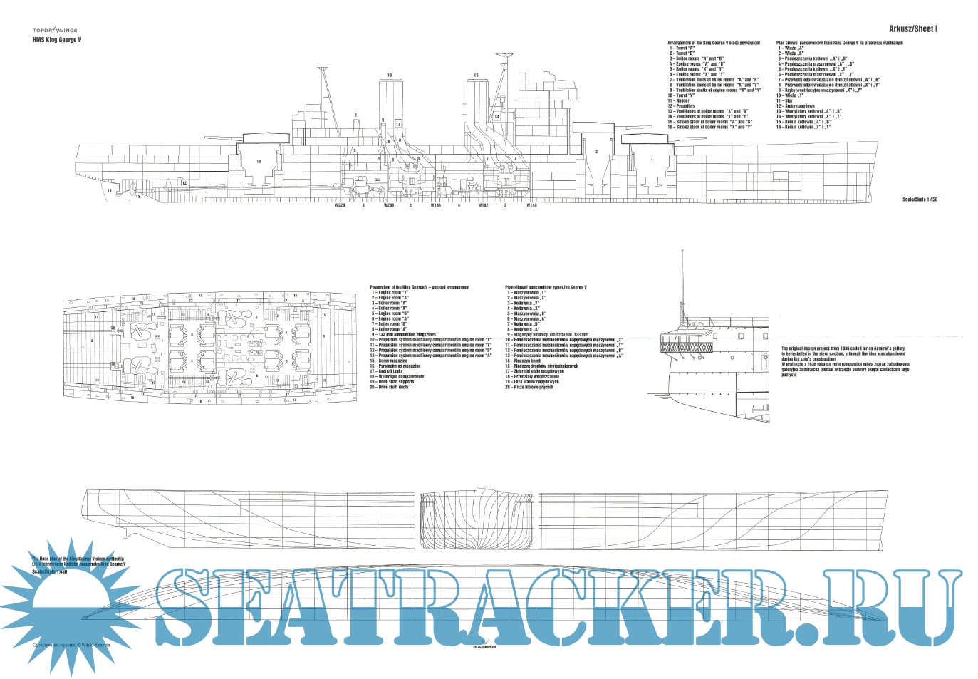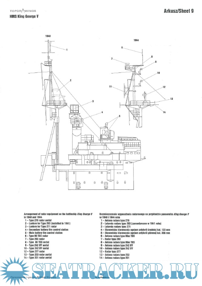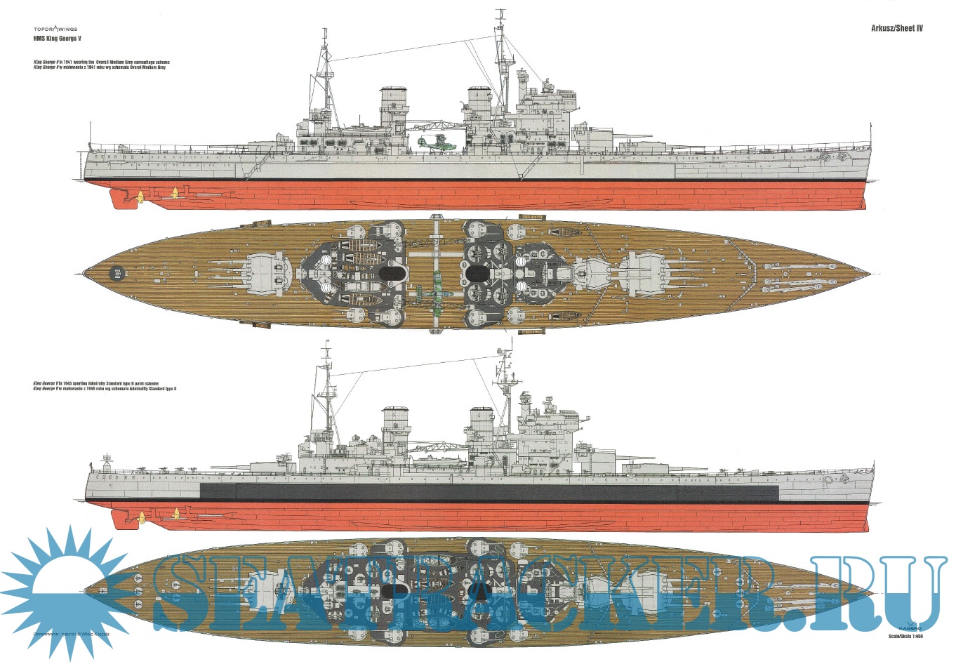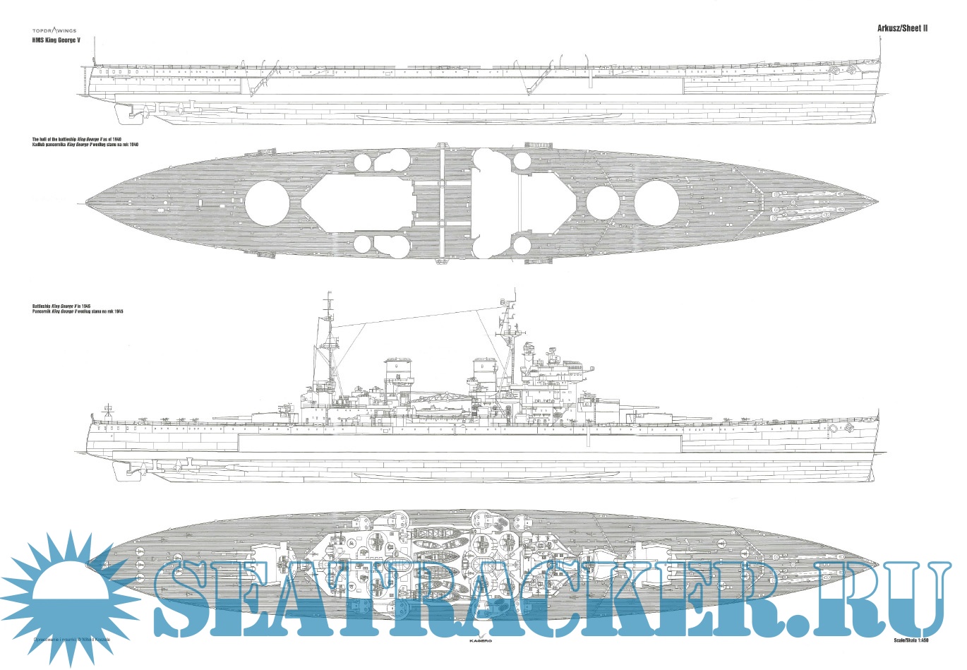 Year: 2013 Language: English, Polish Author: Witold Koszela Genre: Drawing Edition: Kagero Topdrawings 17 Format: PDF Quality: eBook Pages count: 32 Description: At the beginning of the 1930s Britain was obliged not to build new battleships due to signed naval treaties. Standard displacement for any new battleship was limited to 35,000 tons with the caliber of main armament not exceeding 406 millimetres. Britain was trying to impose the next treaty decreasing guns caliber even further to 356 mm. Five King George V-class battleships eventually were armed with guns of such caliber. Standard displacement limits compelled placing main guns in three separate turrets with two of them carrying four cannons each. King George V-class entered service in 1940. Out of the five battleships of this class ever built one was sunk (HMS Prince of Wales) while the other four survived the war and were scrapped in the 1950s. This book by Witold Koszela starts with the set of perfectly made detailed line drawings/scale plans of all King George V-class vessels.