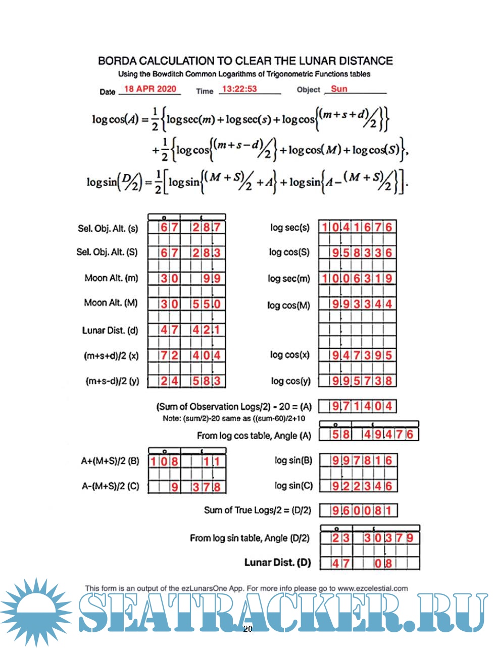 Provides an entire year of pre-computed lunar distances - up to six of the best objects to use each day with distances at 3-hour intervals. It also includes all other tables necessary to do lunars just like the ancient navigators of the 1800's.