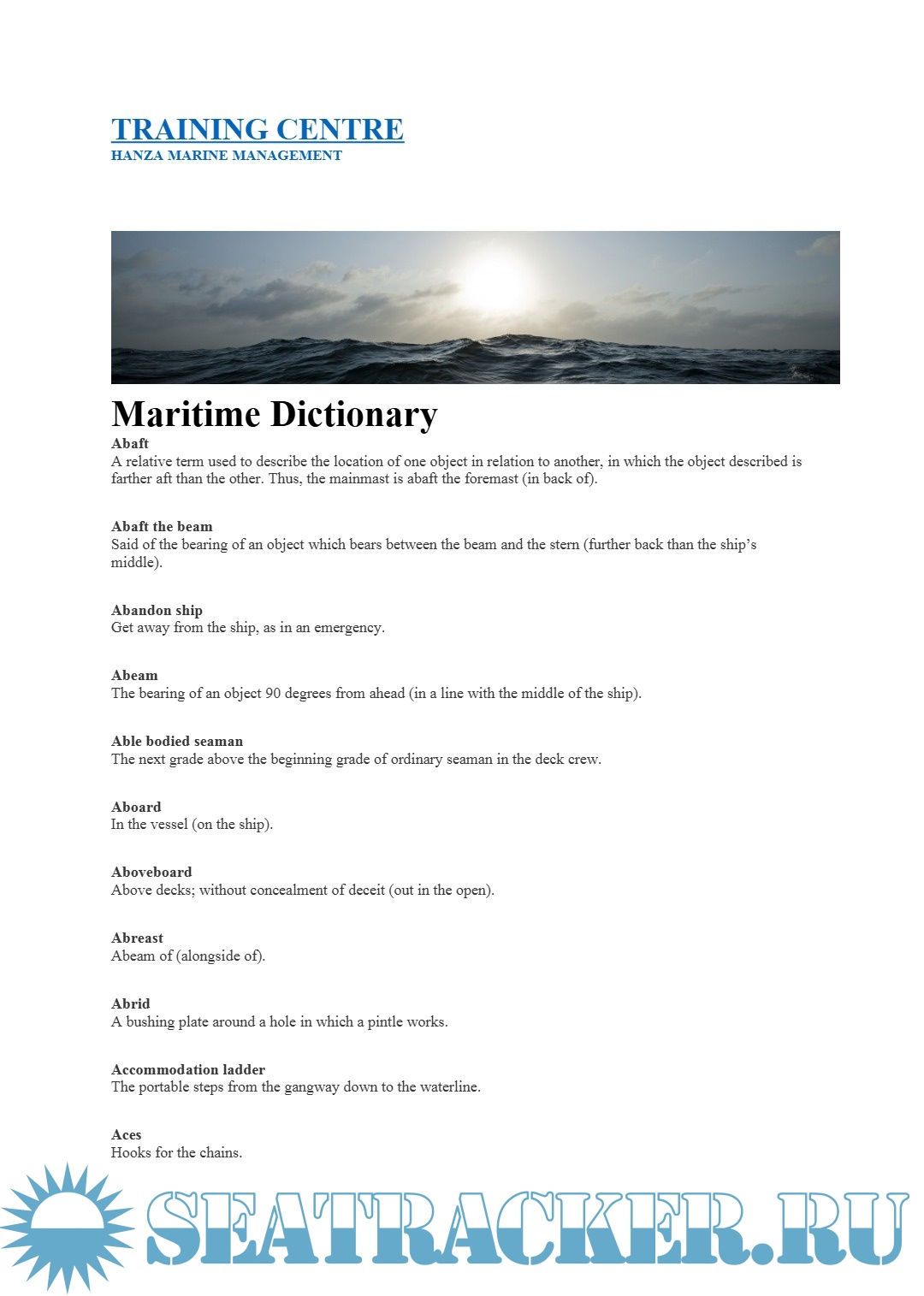 Description: The Maritime Dictionary offered by the TRAINING CENTRE at Hanza Marine Management serves as a comprehensive tool for maritime professionals and students. This resource is designed to simplify complex terminology commonly used in the shipping and maritime industries. It includes detailed explanations of technical terms, abbreviations, and concepts that are essential for safe and efficient vessel operations.