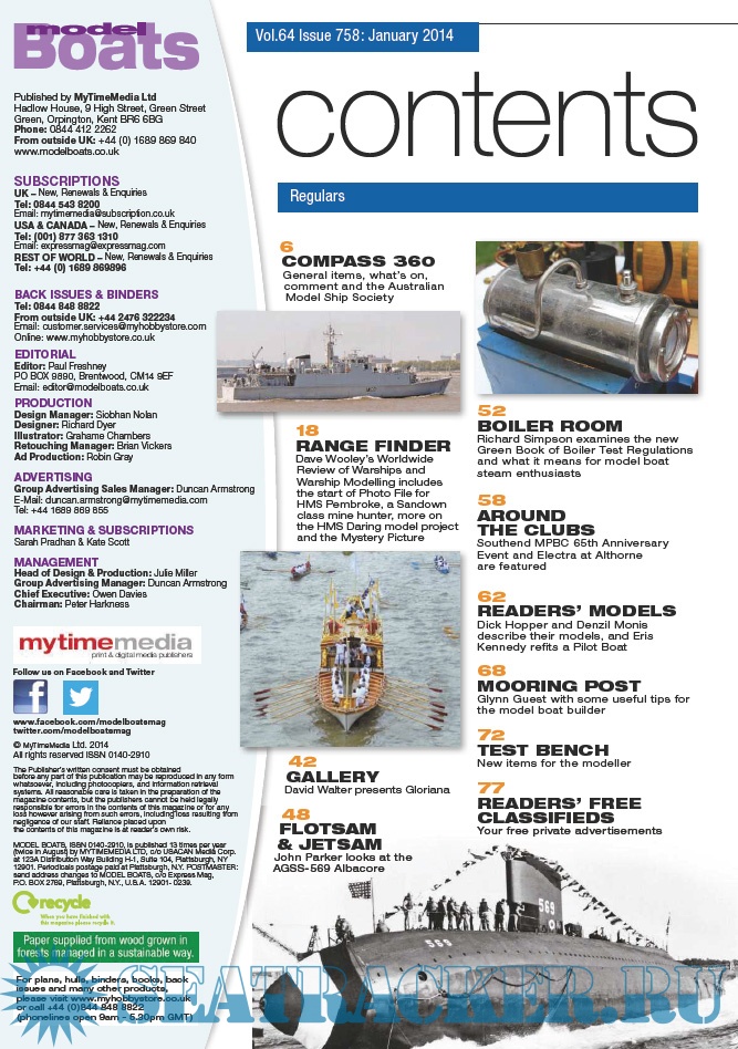 Year: 2014 Language: English Author: Lindsey Amrani (Editor) Genre: Periodical publication Edition: 2014-01 Format: PDF Quality: Scanned pages Pages count: 84 Description: Model Boats magazine is a practical and informative read for those with a love for the hobby. It covers the latest news and views from the various clubs and associations around the country, useful hints, tips and step by step guides for those interested in the art of constructing a model boat as well as tests and recommendations of new boats and tools. Floating along behind these are great special features examining in depth different models from narrowboat to destroyer!
