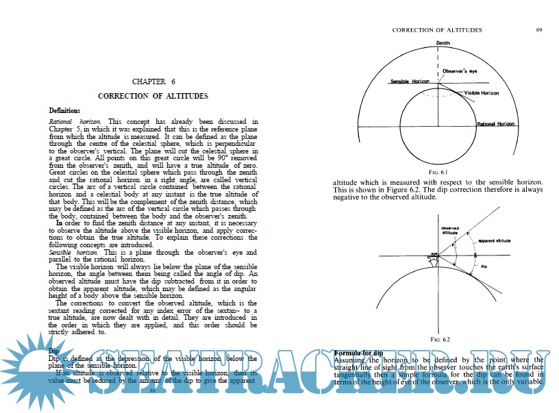 Correction of altitudes. Dip. Refraction. Formulae for dip and refraction. 88