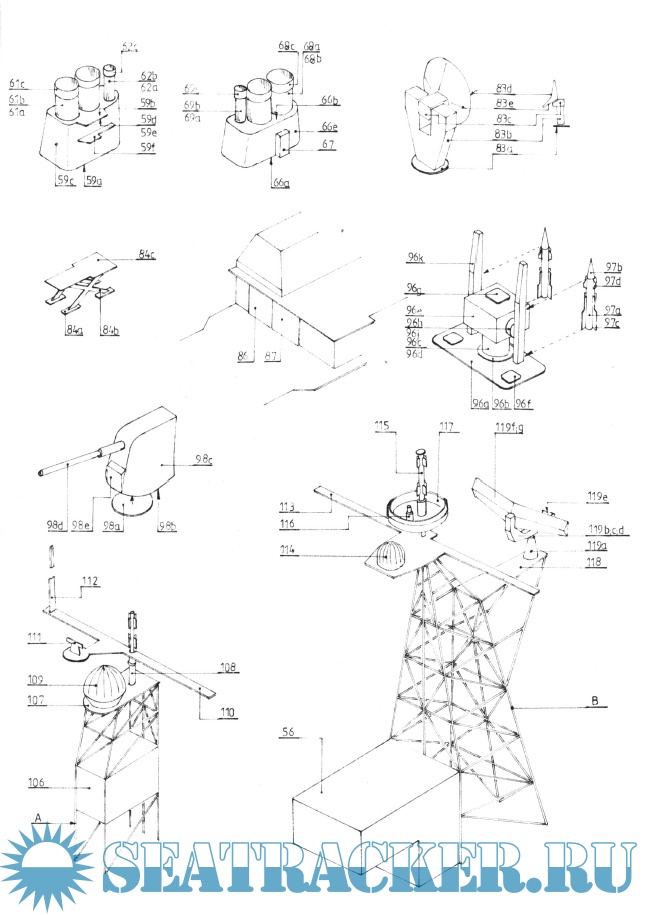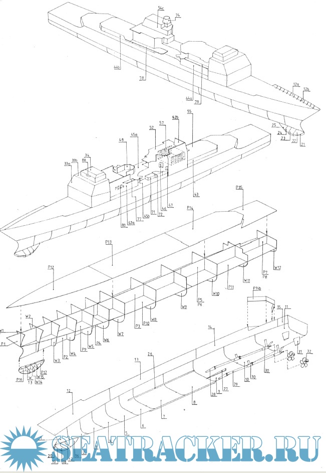 22 листа цветных выкроек и инструкций для изготовления бумажной модели крейсера США USS Ticonderoga в масштабе 1:200