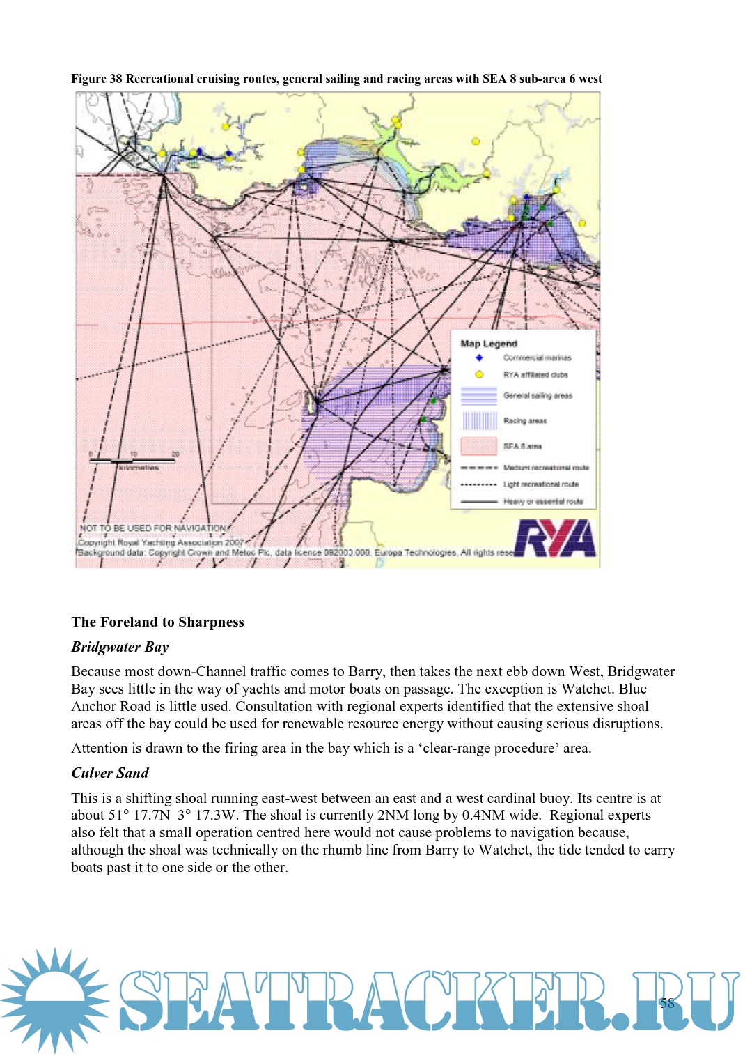 Description: The SEA 8 project has been undertaken by the RYA. This has involved the coordination and collation of data within the SEA 8 area and input and revision of the RYA’s geographical information system. The routes are plotted as straight lines. However, recreational sailing craft rarely operate in straight lines. Their direction of travel is dictated by the direction of wind. This is explained in detail in Annex A. this report also contains a section in Chapter 9 that describes some of the difficulties that may be faced in navigating around some of the different offshore renewable energy structures.