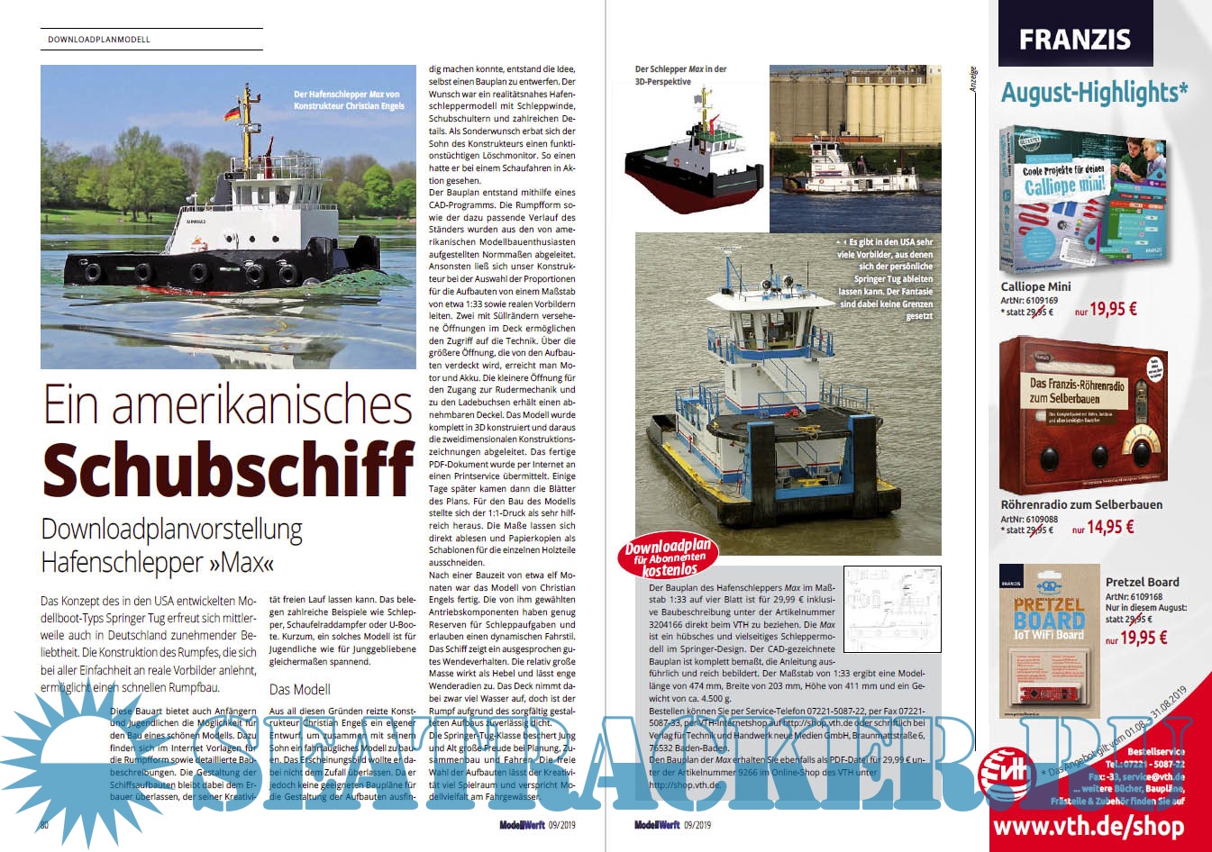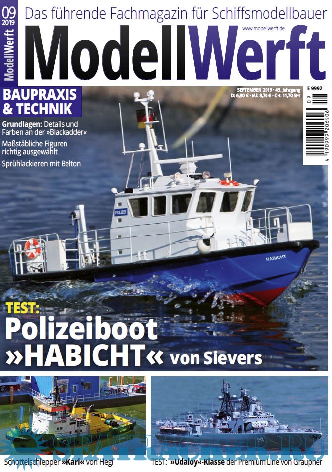 Year: 2019 Language: German Author: Eric Schafenrort (Redaktor) Genre: Periodical publication Format: PDF Quality: eBook Pages count: 84 Description: Das führende Fachmagazin für Schiffsmodellbauer. Egal ob Stand- oder Fahrmodell, ob kleines Segelboot oder gigantisches Kreuzfahrtschiff. Die Modellwerft informiert über Neuheiten, hilft mit Bautipps und fasziniert mit besonderen Reportagen.