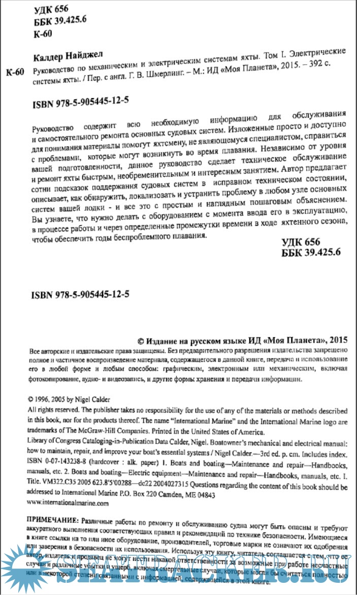 Год выпуска: 2017 Язык: Русский Автор: Калдер Н. Жанр: Руководство Издательство: Моя планета Формат: DjVu Качество: Отсканированные страницы (с перекосами) Количество страниц: 388 Описание: Руководство содержит всю необходимую информацию для обслуживания и самостоятельного ремонта основных судовых систем. Изложенные просто и доступно для понимания материалы помогут яхтсмену, не являющемуся специалистом, справиться с проблемами, которые могут возникнуть во время плавания. Независимо от уровня вашей подготовленности, данное руководство сделает техническое обслуживание и ремонт яхты, быстрым, необременительным и интересным занятием. Автор предлагает сотни подсказок поддержания судовых систем в исправном техническом состоянии, описывает, как обнаружить, локализовать и устранить проблему в любом узле основных систем вашей лодки - и все это простым и наглядным пошаговым объяснением. Вы узнаете, что нужно делать с оборудованием с момента ввода его в эксплуатацию, в процессе работы и через определенные промежутки времени в ходе яхтенного сезона, чтобы обеспечить годы беспроблемного плавания.