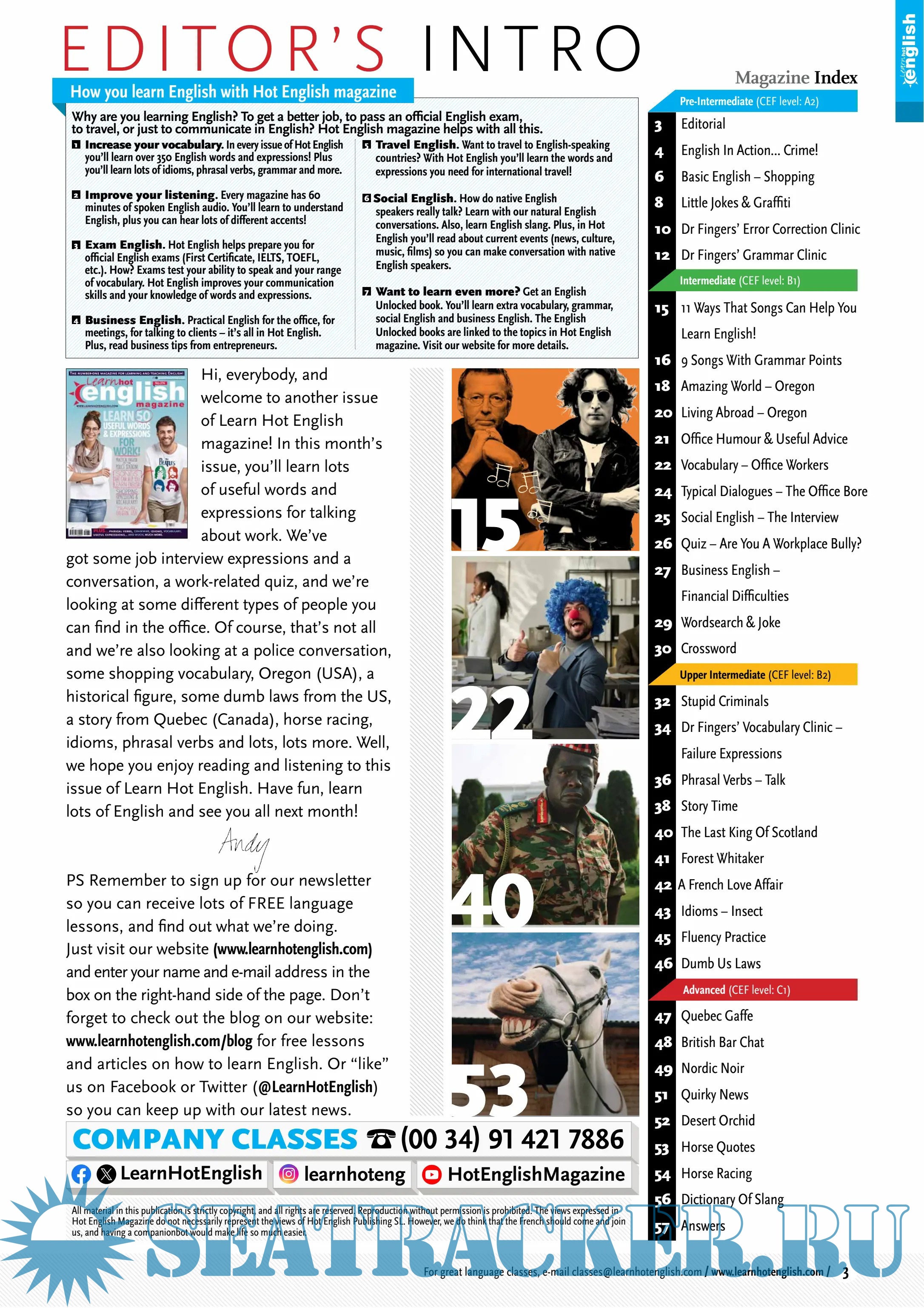 English for all levels (easy – advanced). A monthly magazine for learning English. Idioms, phrasal verbs, useful expressions, grammar, vocabulary. Learn faster because it’s fun! Studying English for an exam, work, or fun? Then Hot English is number 1!