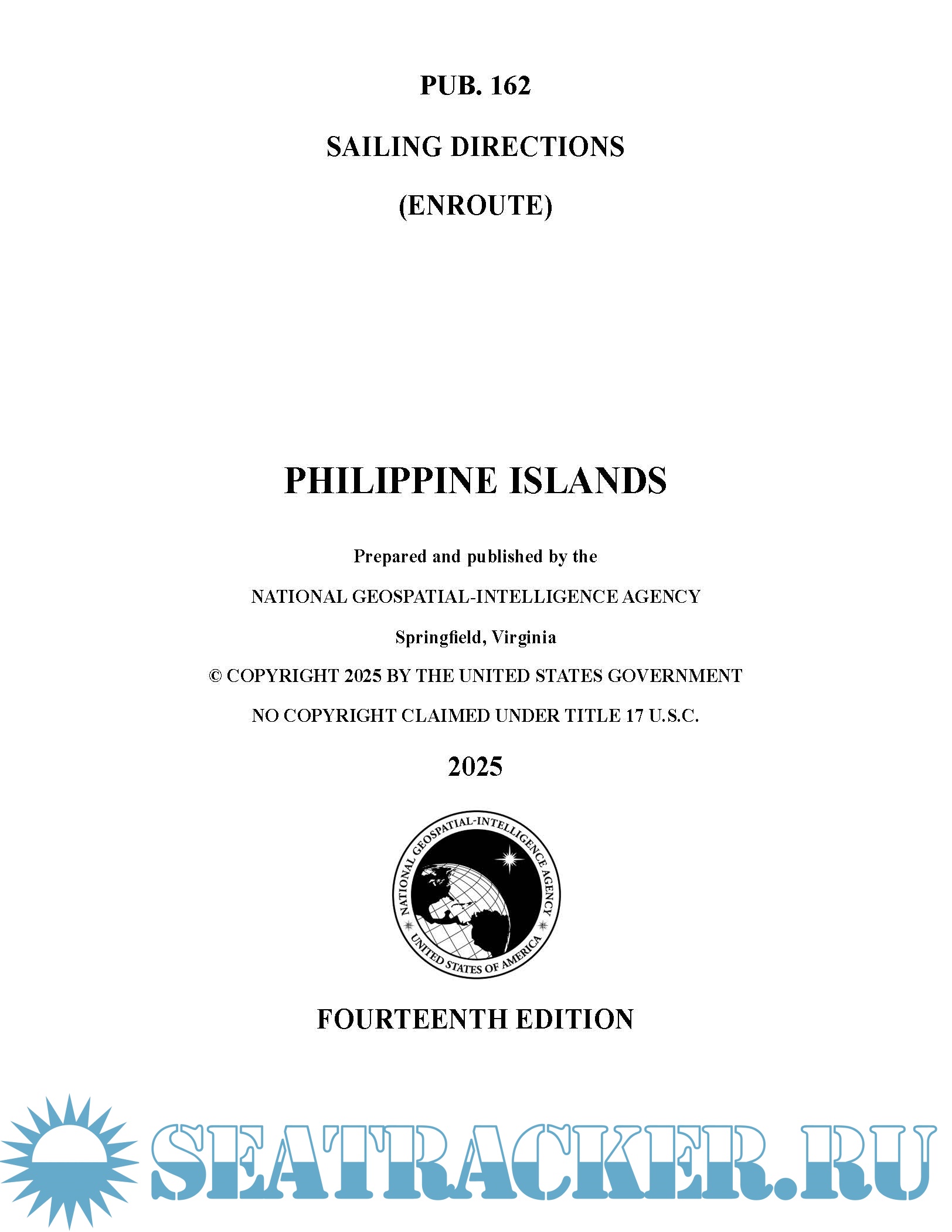 Year: 2025 Language: English Author: National Geospatial Intelligence Agency Genre: Documentation Edition: 14th Format: PDF Quality: eBook Pages count: 409 Description: Pub. 162, Sailing Directions (Enroute) Philippine Islands, Fourteenth Edition, 2025, is issued for use in conjunction with Pub. 120, Sailing Directions (Planning Guide) Pacific Ocean and Southeast Asia. Companion volumes are Pubs. 126, 161, 163, and 164. Digital Nautical Charts 11 and 23 provide electronic chart coverage for the area covered by this publication. Electronic Nautical Charts Regions S1 and T1 provide electronic chart coverage for the area covered by this publication. This publication has been corrected to 8 February 2025.