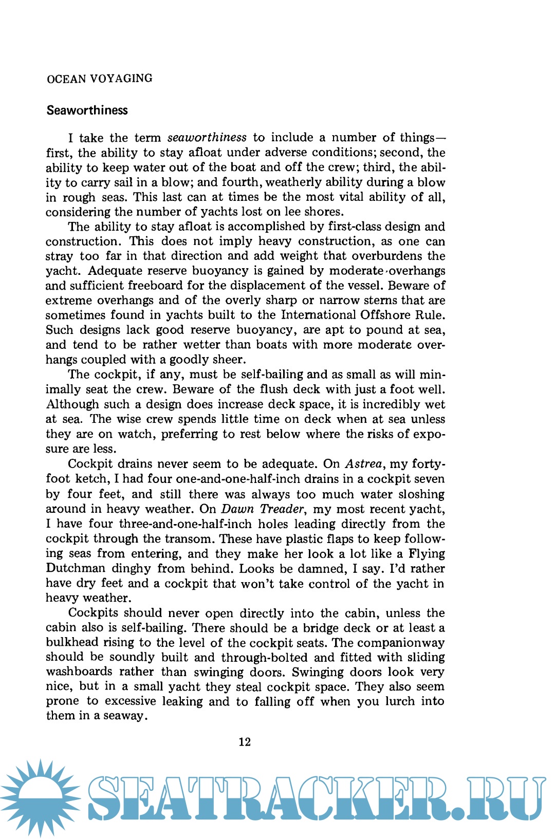 He also has excellent chapters summarizing practical lessons learned on seamanship and navigation. He tells how to plan a voyage and provision ship. On the subject of self-steering, so important to an enjoyable passage, he describes in detail several systems that have proven satisfactory at sea.
