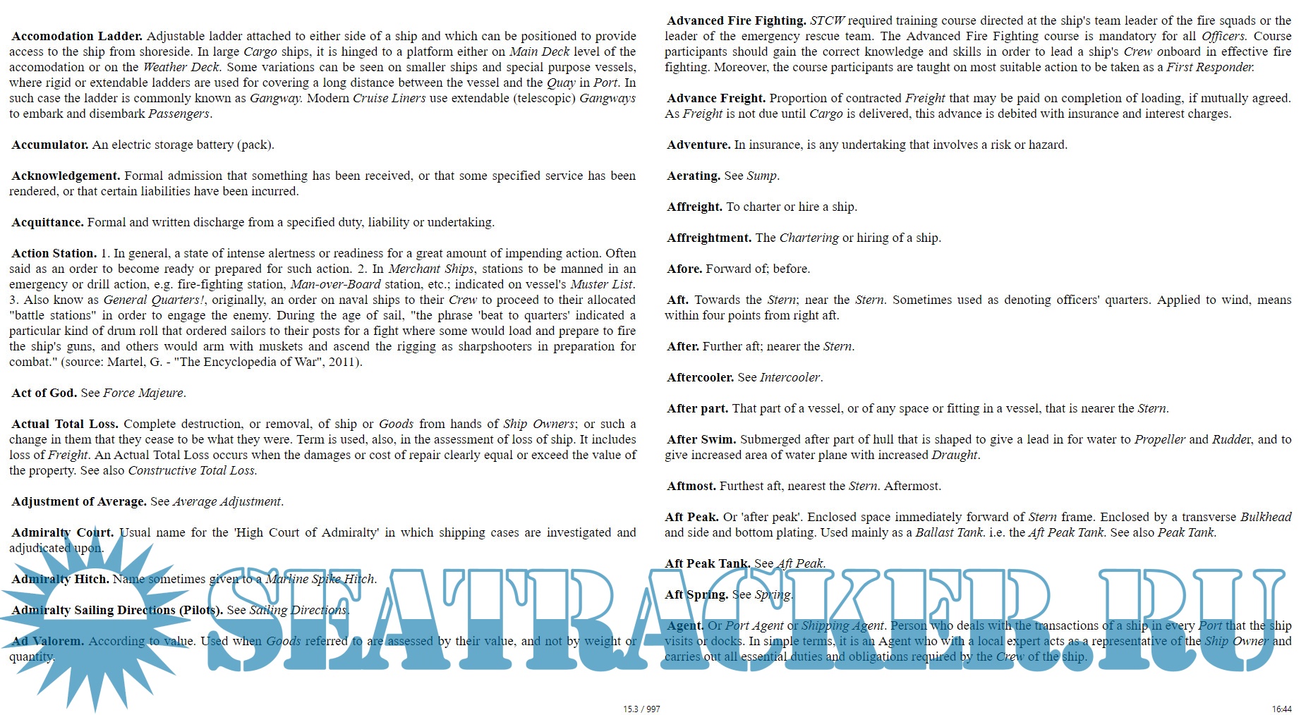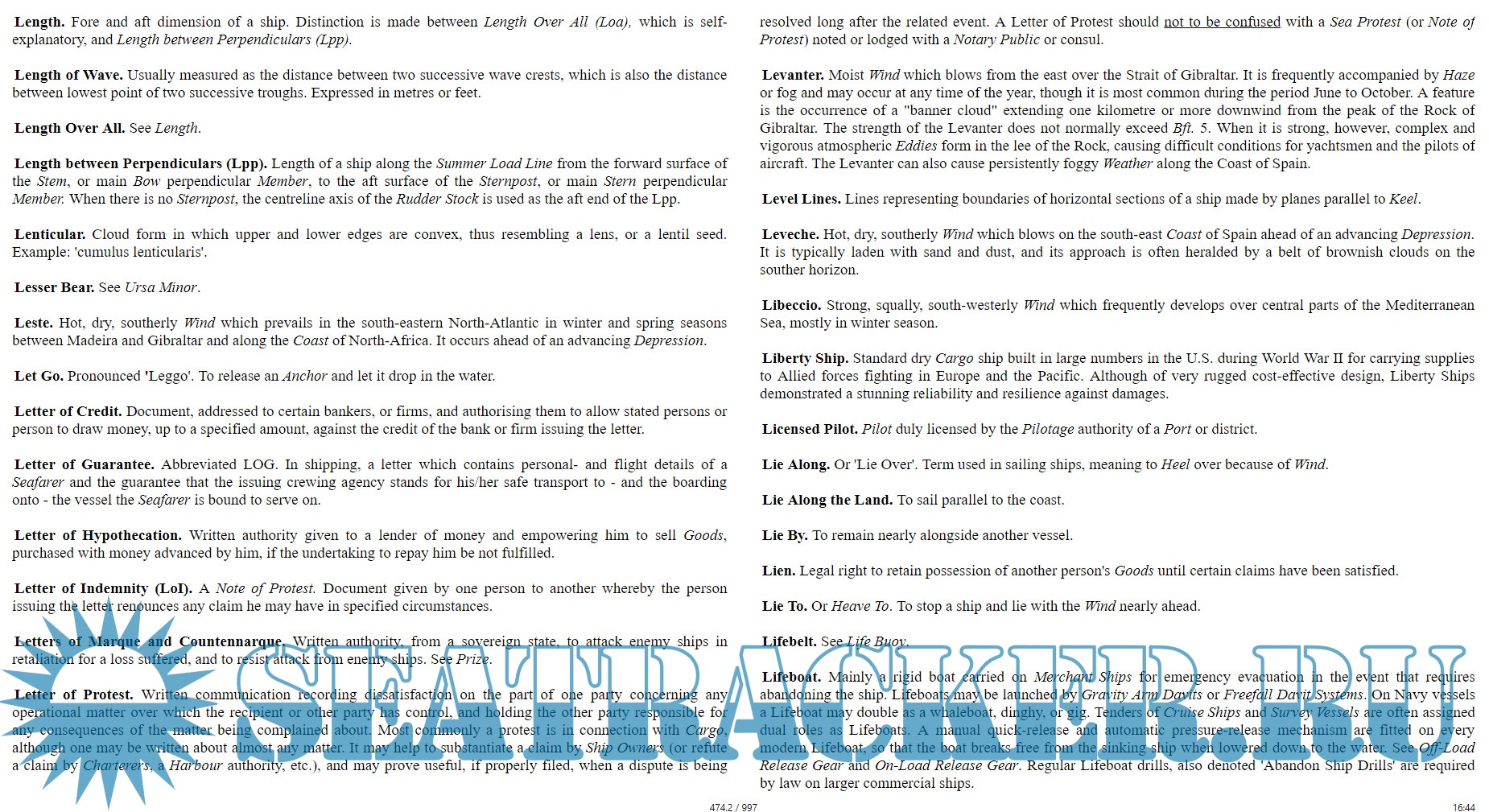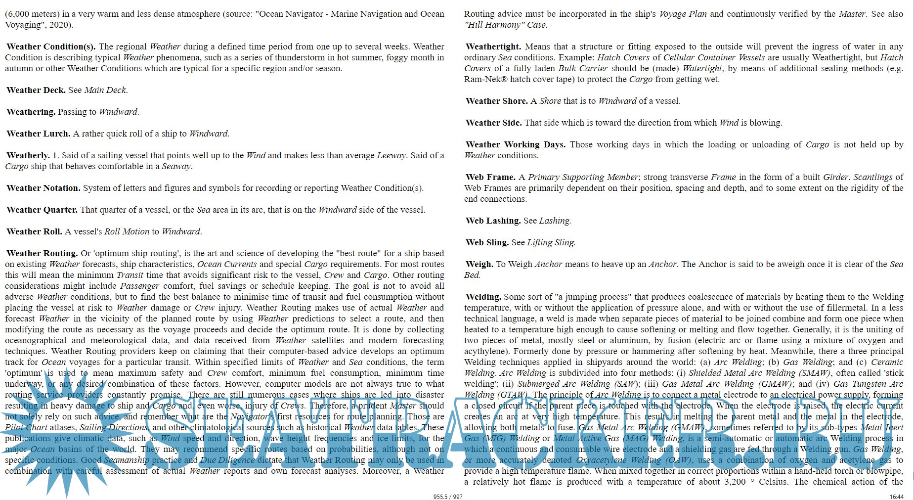 Description: "Captain Pete's Marine Knowledge Base" is a concise glossary of terms and phrases widely used in today's shipping industry. It has been compiled for purposes of education, competence development and occupational awareness in the professional maritime field. Although primarily addressed to seafarers of all nations and ranks, this vocabulary may certainly be helpful also for those who have an interest in using the included information for research and studies. However, the definitions and explanations provided shall not be construed as to constitute legal or technical advice. As a knowledge base, this special dictionary is aimed at promoting education through the spread of expert information and by annotating technical and scientific principles. Therefore, it is released and added to the public domain.