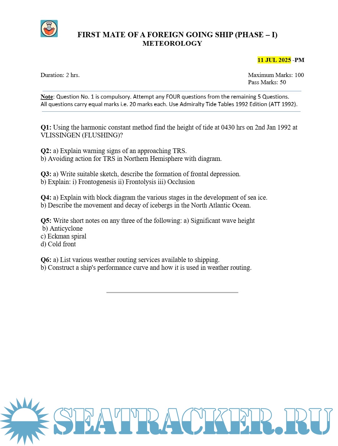 Question Paper Set Meteorology (July 2025) Phase I (Chief Mate F.G.) Mercantile Marine Department (MMD), India Examinations