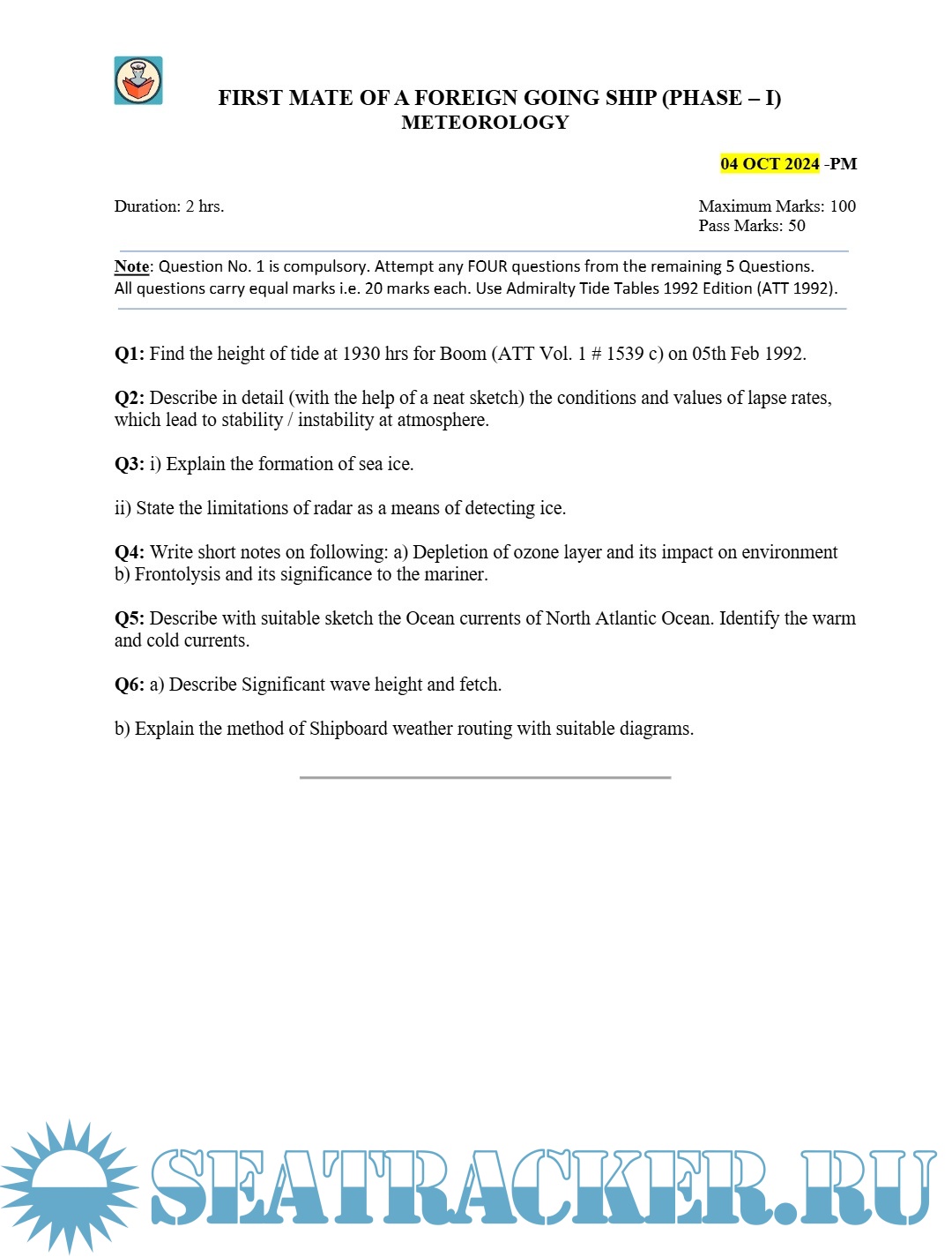 Description: Question paper set for Meteorology Mercantile Marine Department (MMD), India Exams for Phase I - Chief Mate (F.G.).