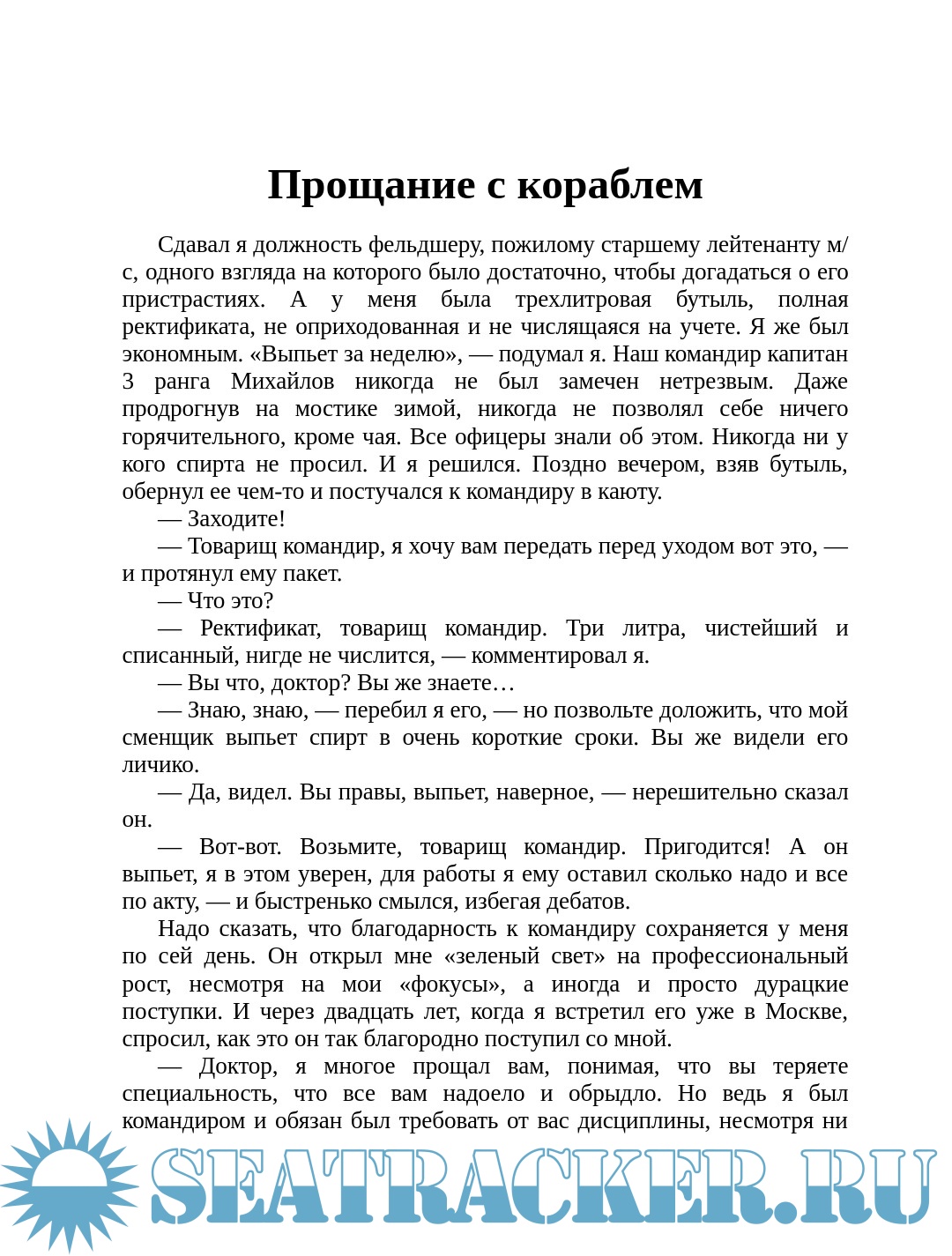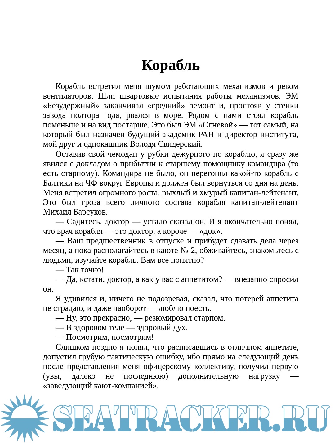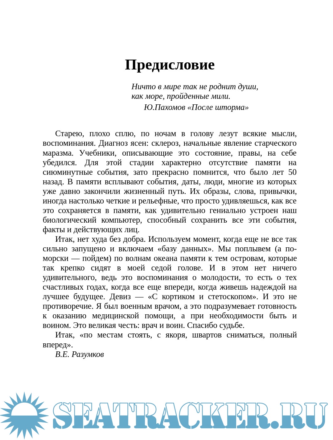 Описание: В памяти всплывают события, даты, люди, многие из которых уже давно закончили жизненный путь. Их образы, слова, привычки, иногда настолько четкие и рельефные, что просто удивляешься, как все это сохраняется в памяти, как удивительно гениально устроен наш биологический компьютер, способный сохранить все эти события, факты и действующих лиц. И в этом нет ничего удивительного, ведь это воспоминания о молодости, то есть о тех счастливых годах, когда все еще впереди, когда живешь надеждой на лучшее будущее. Девиз — «С кортиком и стетоскопом». И это не противоречие. Я был военным врачом, а это подразумевает готовность к оказанию медицинской помощи, а при необходимости быть и воином. Это великая честь: врач и воин. Спасибо судьбе. Итак, «по местам стоять, с якоря, швартов сниматься, полный вперед».