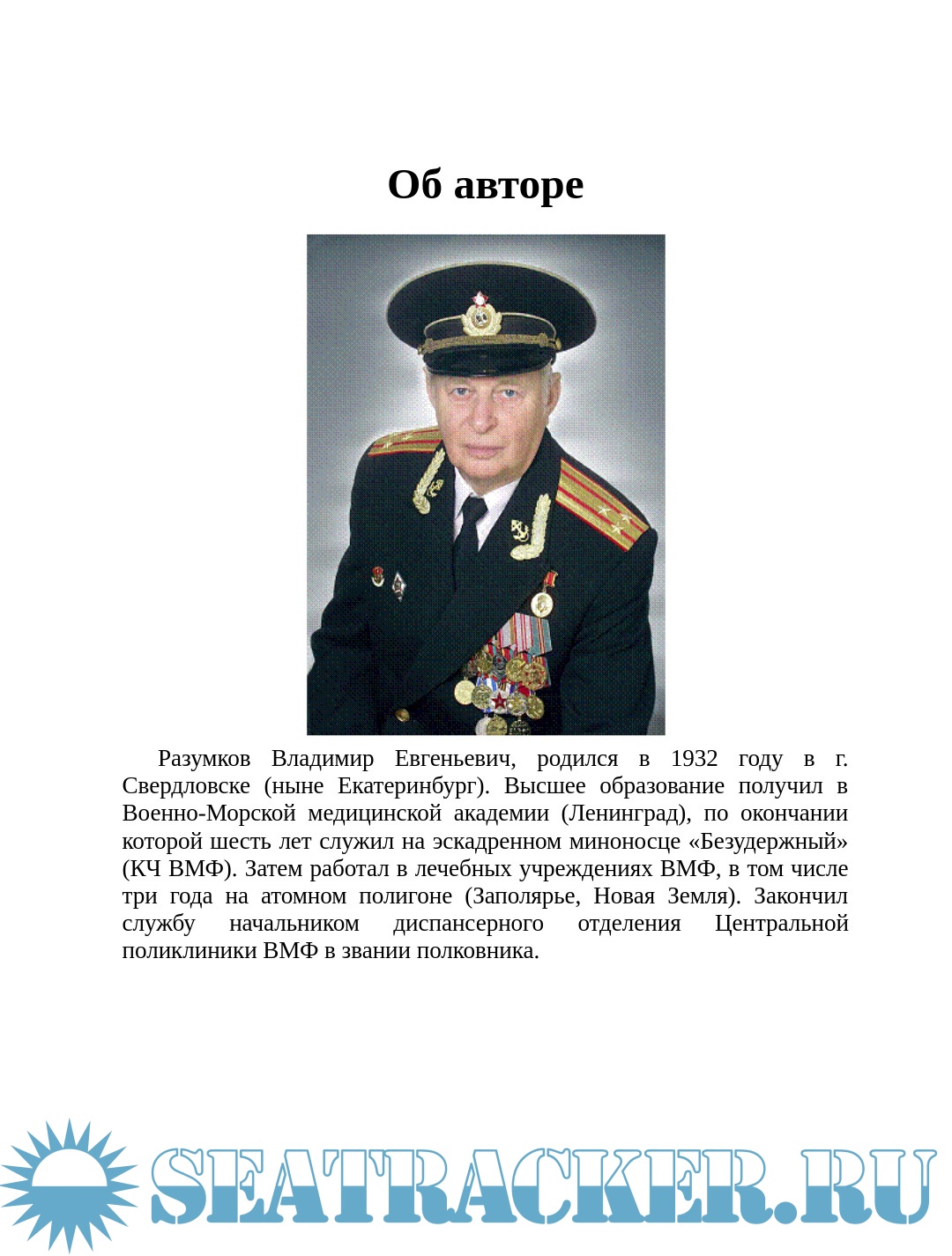 Автор книги закончил Военно-Морскую медицинскую академию (Ленинград), по окончании которой шесть лет служил на эскадренном миноносце «Безудержный» (КЧ ВМФ).