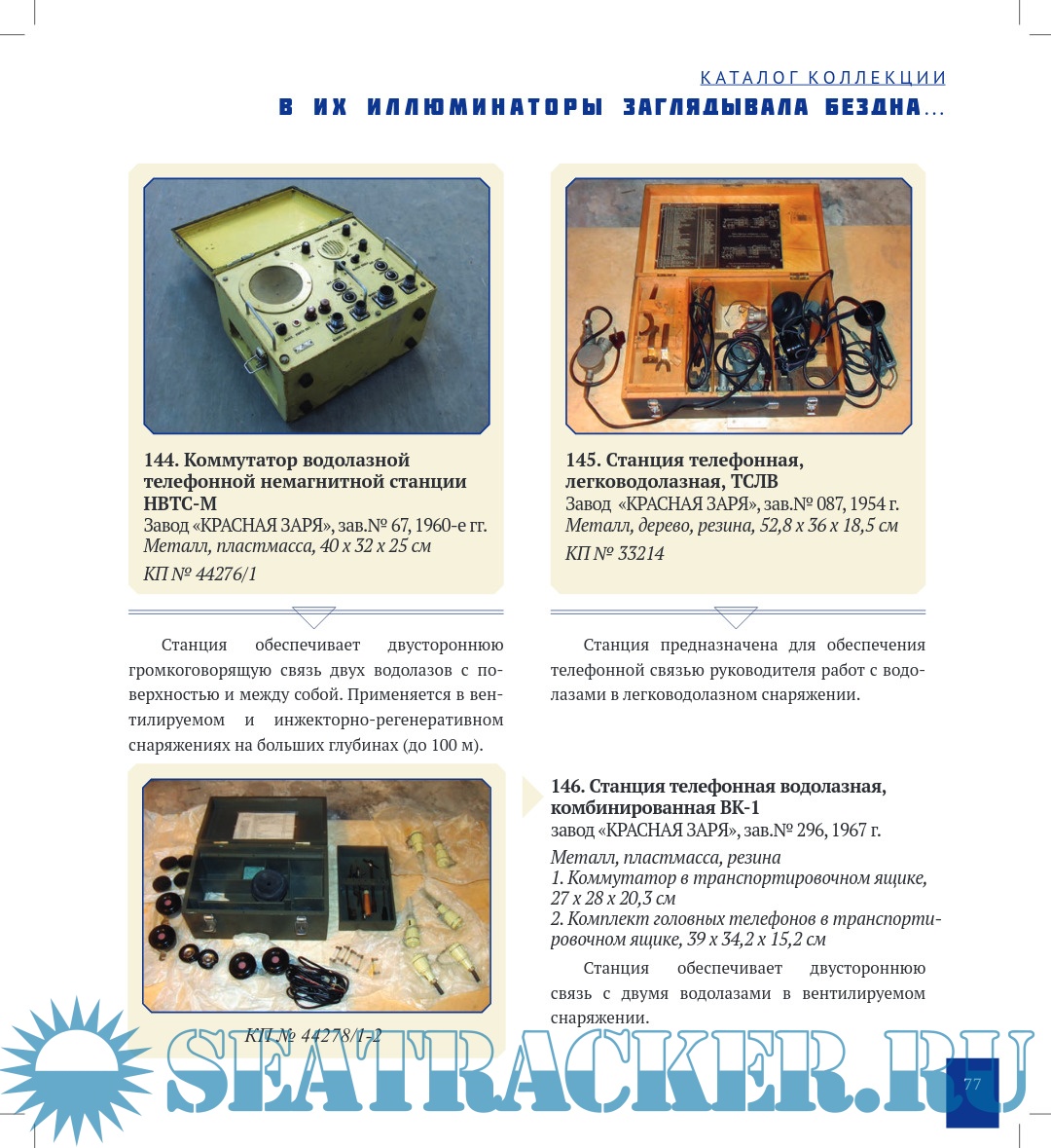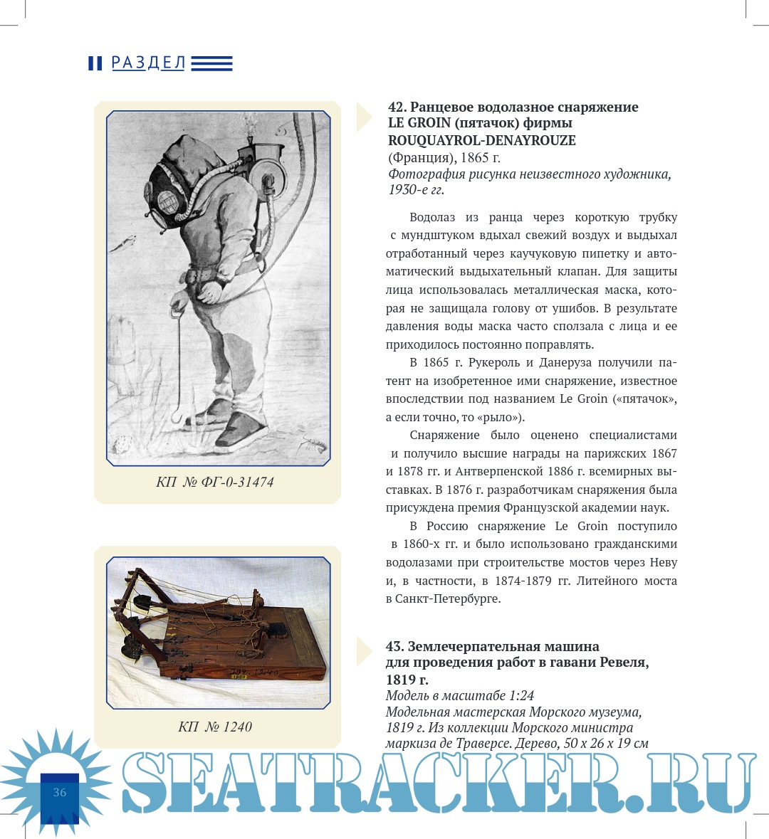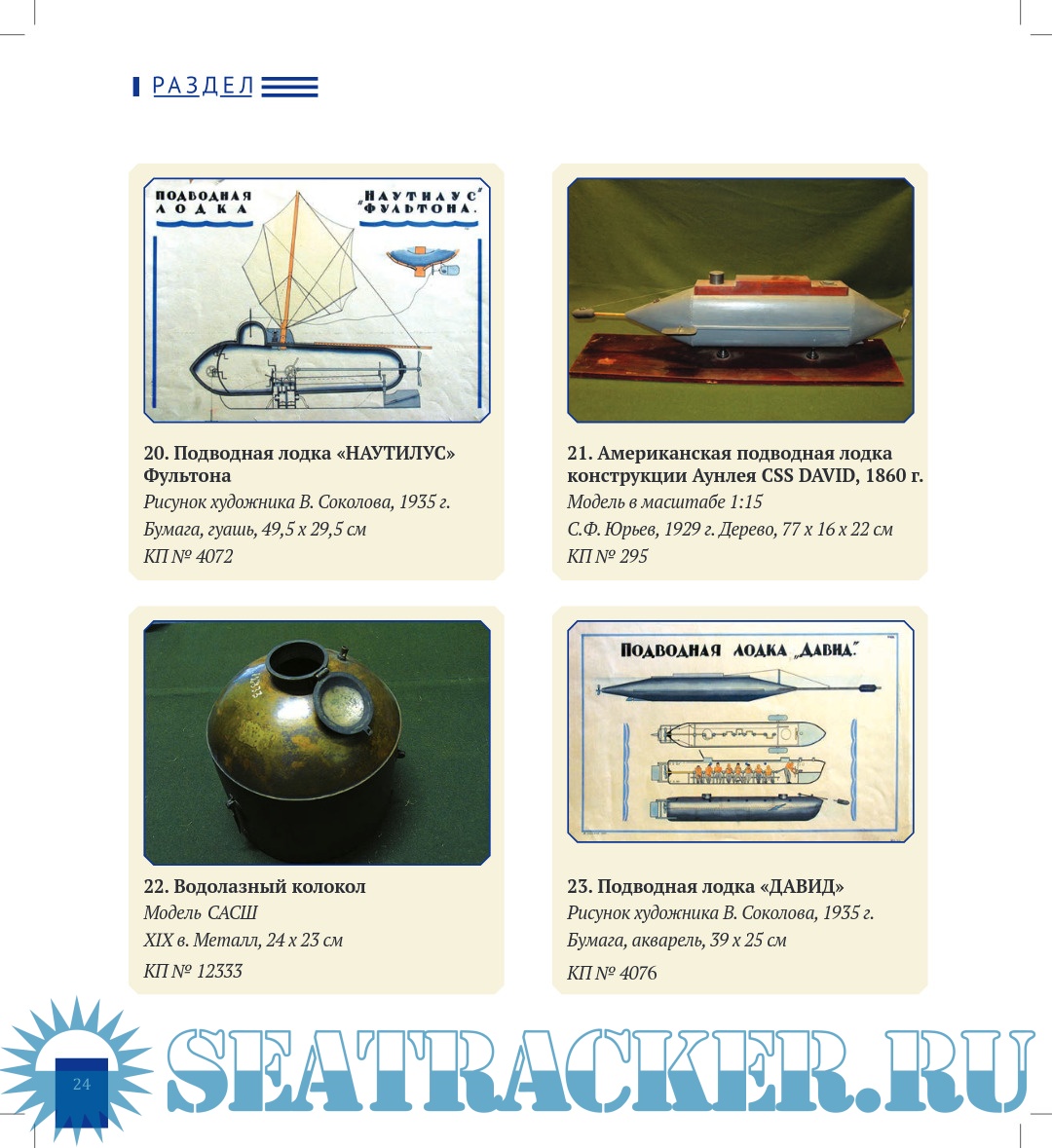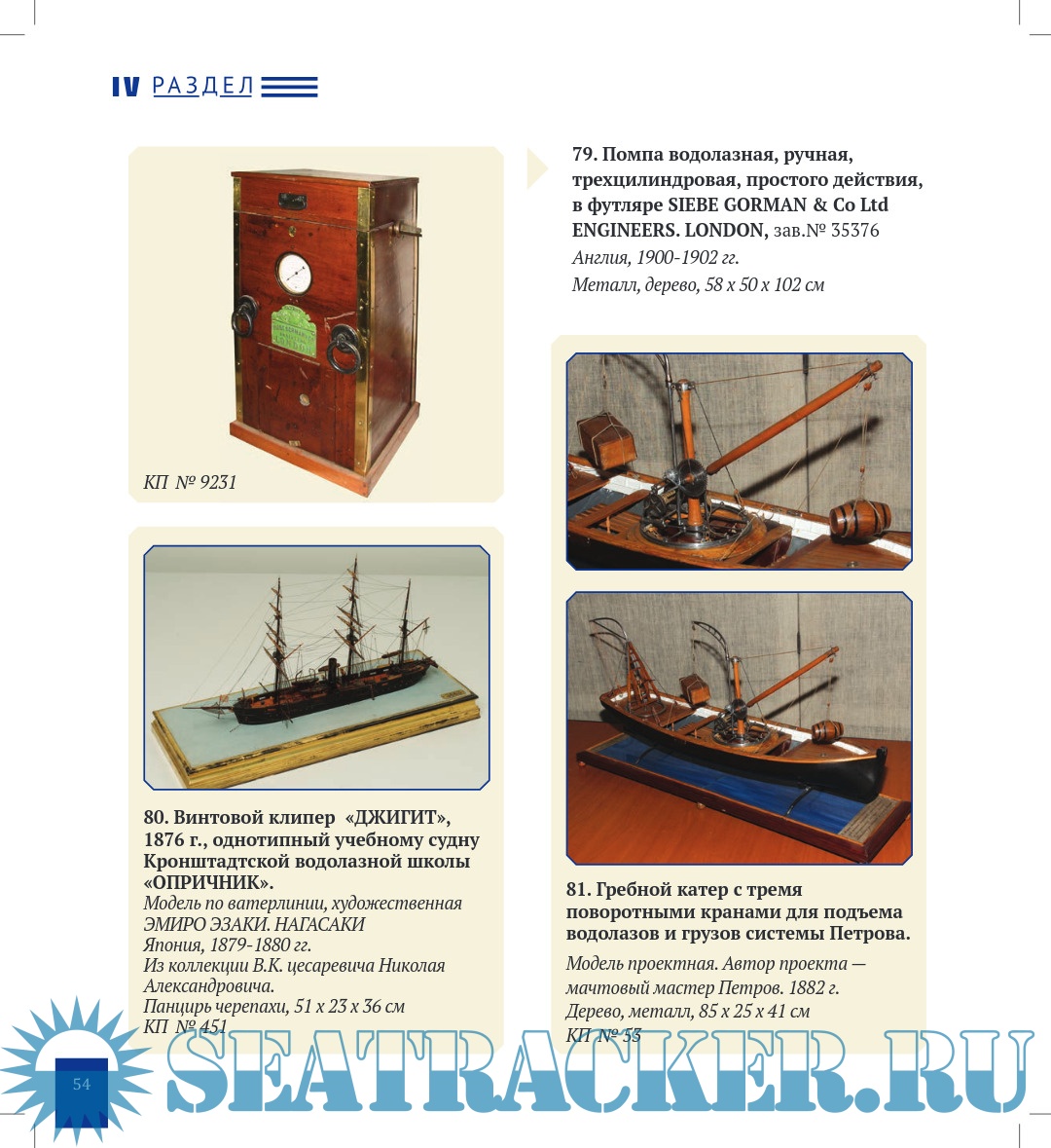 В данной работе систематизирована и представлена богатейшая коллекция водолазного снаряжения, инструментов для подводных работ, осветительных приборов, помп, средств связи и других атрибутов подводных работ (спасательных, поисковых технических, диверсионных и научноисследовательских) за всю историю музея с 1709 года по настоящее время.