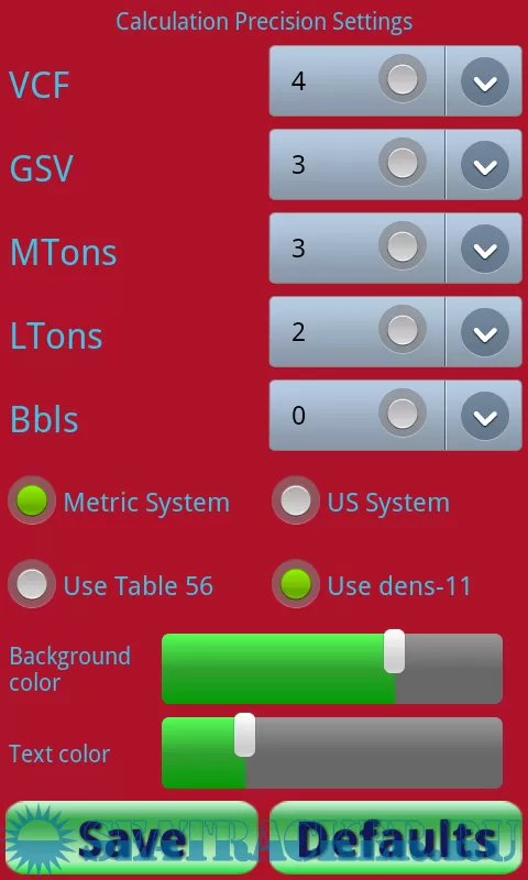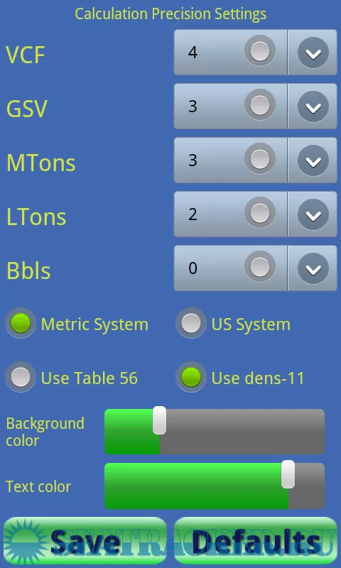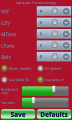 Precision for VCF, GSV, MTons, LTons and Bbls can be changed using a settings screen. Settings are saved in the app so that when you use the app next time it will calculate with your chosen settings.