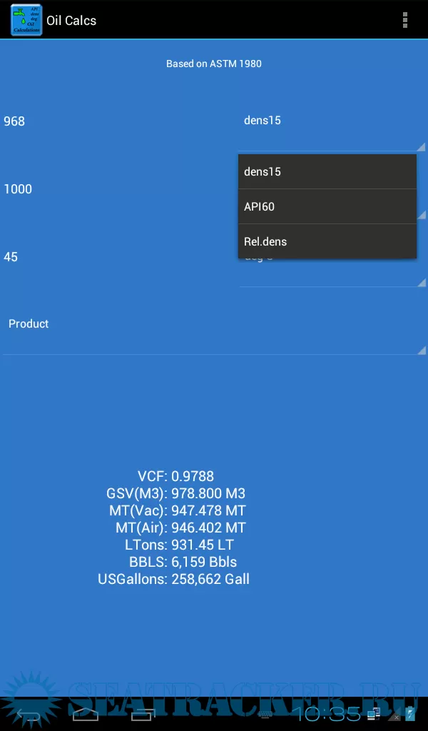 The app uses the ASTM tables (1980) and formulas to calculate weights and volumes based on entered density@15 or API, observed volume and temperature, and calculates the following: