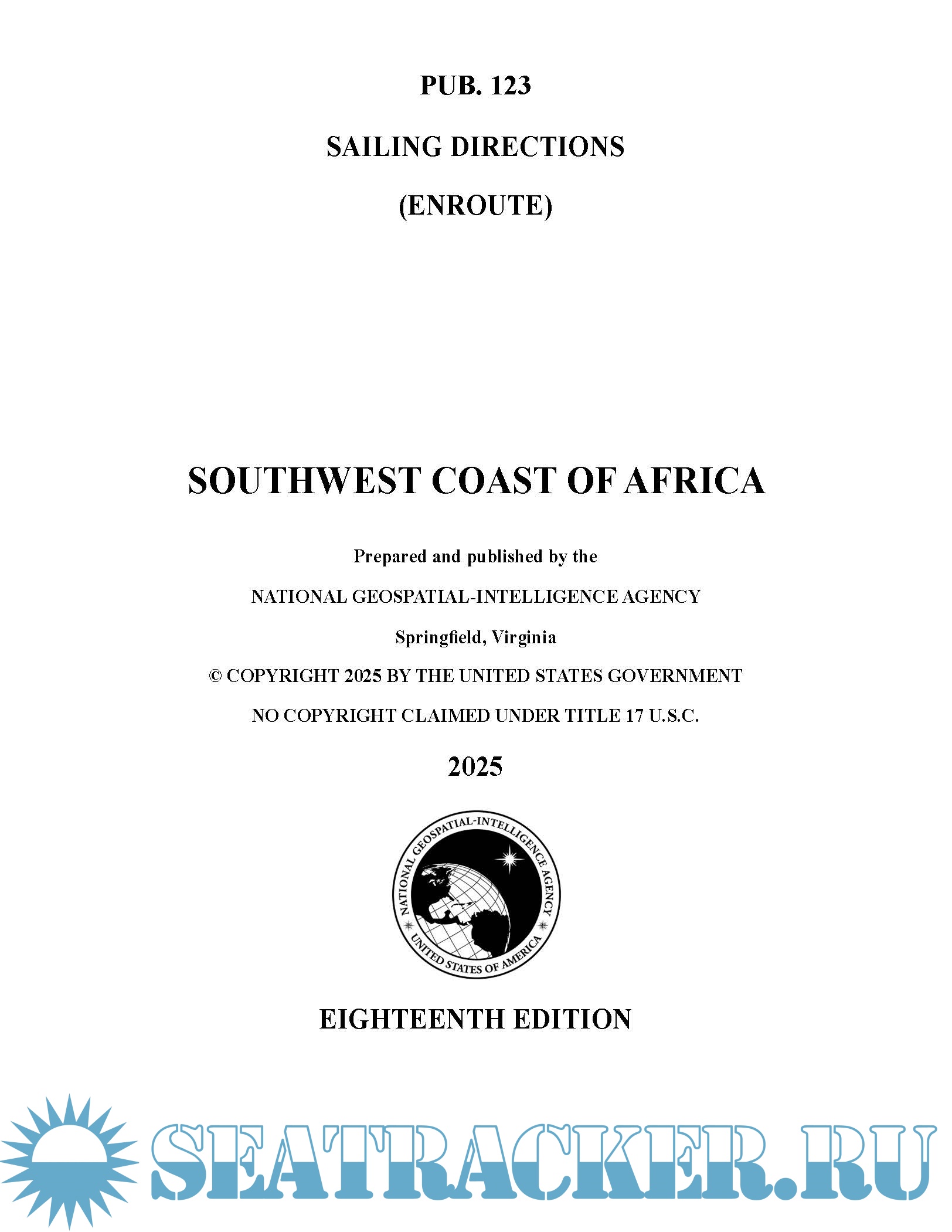 Description: Pub. 123, Sailing Directions (Enroute) Southwest Coast of Africa, Eighteenth Edition, 2025, is issued for use in conjunction with Pub. 160, Sailing Directions (Planning Guide) South Atlantic Ocean and Indian Ocean. The companion volume is Pub. 124.