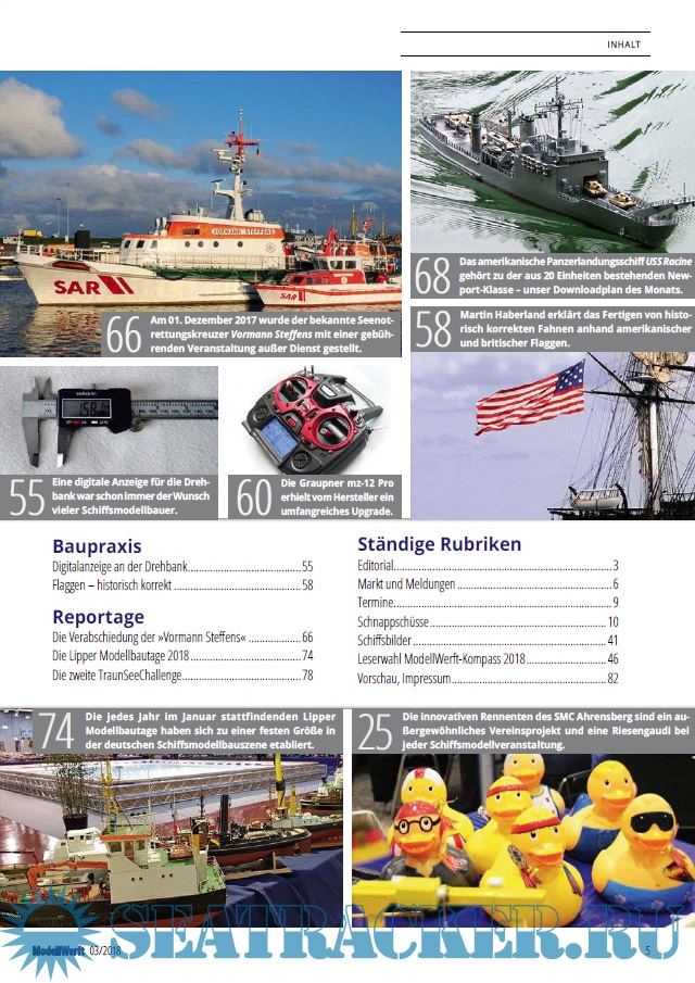 Year: 2018 Language: German Author: Eric Schafenrort (Redaktor) Genre: Periodical publication Edition: 2018-03 Format: PDF Quality: eBook Pages count: 84 Description: Das führende Fachmagazin für Schiffsmodellbauer. Egal ob Stand- oder Fahrmodell, ob kleines Segelboot oder gigantisches Kreuzfahrtschiff. Die Modellwerft informiert über Neuheiten, hilft mit Bautipps und fasziniert mit besonderen Reportagen.