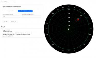 This simulator allows students, Cadets, Officers and Captains to verify the correct execution of drawings and calculations on the maneuvering board to have all the movement data of the ships in the area. The file allows them to simulate all evasive maneuvers and within few seconds to choose the most suitable maneuver.