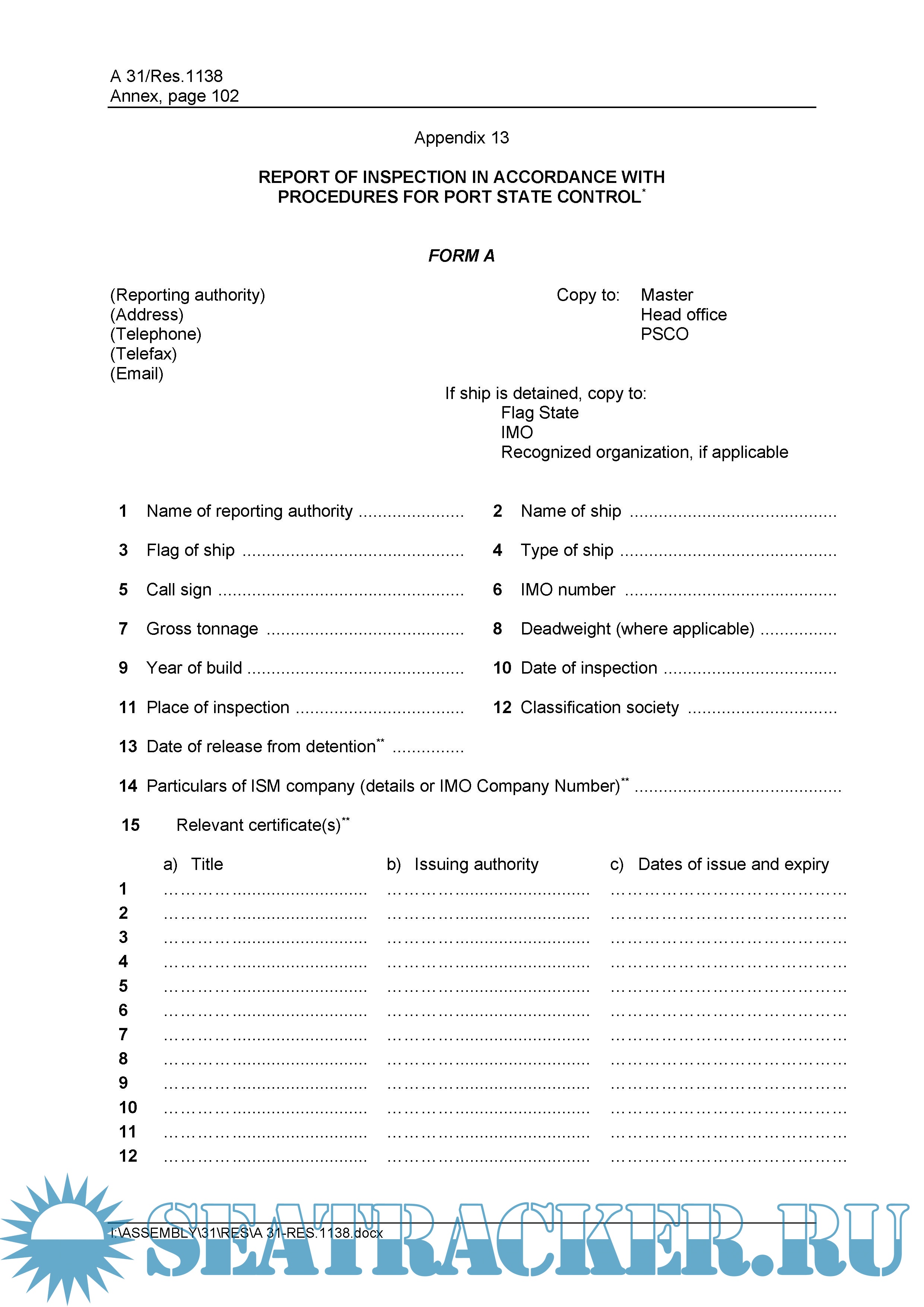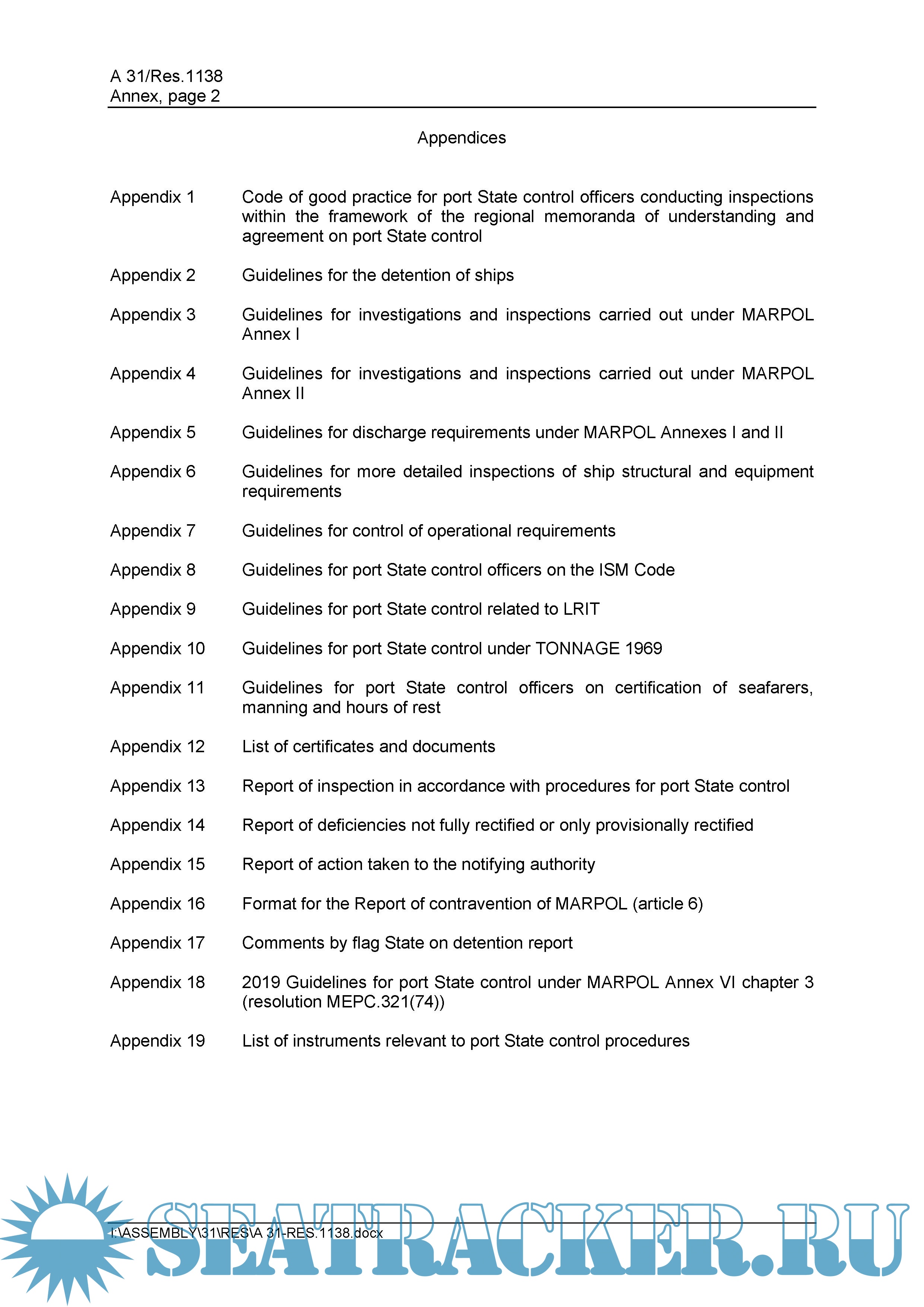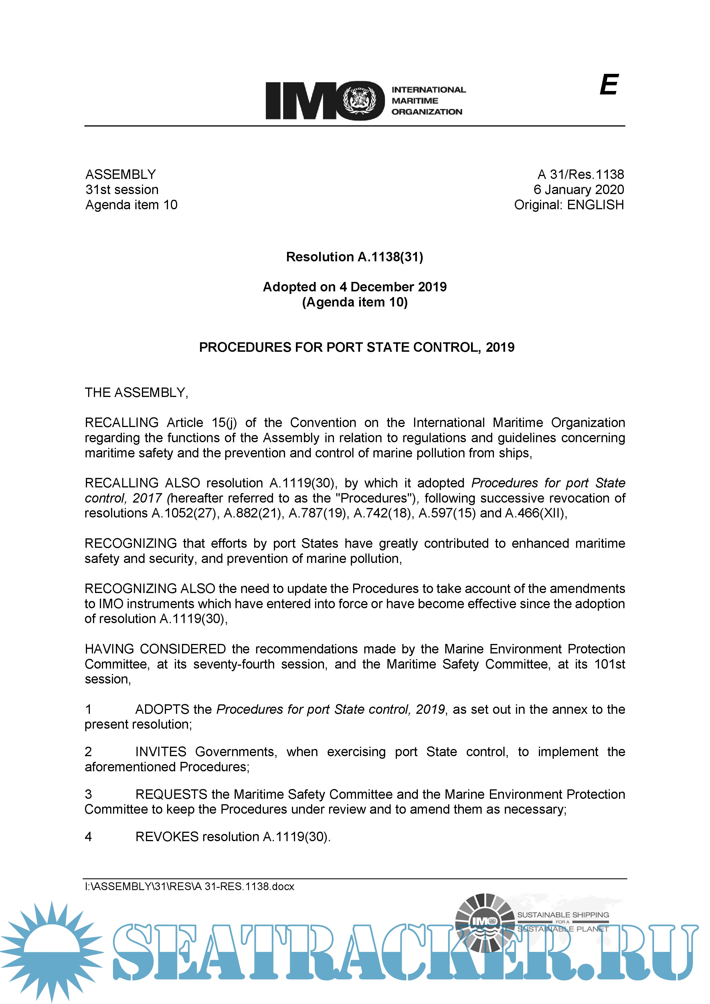 Year: 2020 Language: english Author: IMO ASSEMBLY Genre: Practical guide Publisher: International Maritime Organization Format: PDF Quality: Unknown Pages count: 130 Description: RESOLUTION A.1138(31) (Adopted on 4 December 2019) PROCEDURES FOR PORT STATE CONTROL, 2019 THE ASSEMBLY, RECALLING Article 15(j) of the Convention on the International Maritime Organization regarding the functions of the Assembly in relation to regulations and guidelines concerning maritime safety and the prevention and control of marine pollution from ships, RECALLING ALSO resolution A.1119(30), by which it adopted Procedures for port State control, 2017 (hereafter referred to as the "Procedures"), following successive revocation of resolutions A.1052(27), A.882(21), A.787(19), A.742(18), A.597(15) and A.466(XII), RECOGNIZING that efforts by port States have greatly contributed to enhanced maritime safety and security, and prevention of marine pollution, RECOGNIZING ALSO the need to update the Procedures to take account of the amendments to IMO instruments which have entered into force or have become effective since the adoption of resolution A.1119(30), HAVING CONSIDERED the recommendations made by the Marine Environment Protection Committee, at its seventy-fourth session, and the Maritime Safety Committee, at its 101st session, 1 ADOPTS the Procedures for port State control, 2019, as set out in the annex to the present resolution; 2 INVITES Governments, when exercising port State control, to implement the aforementioned Procedures; 3 REQUESTS the Maritime Safety Committee and the Marine Environment Protection Committee to keep the Procedures under review and to amend them as necessary; 4 !!!REVOKES!!! resolution A.1119(30) (