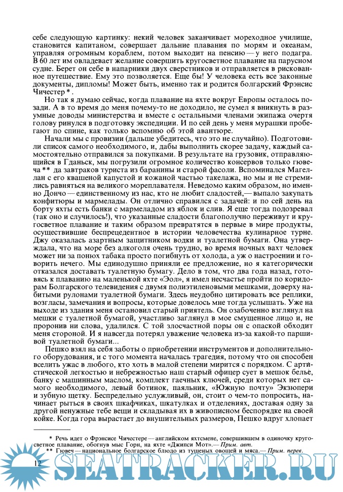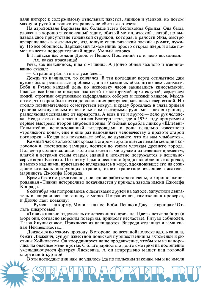 Год выпуска: 1993 Язык: Русский Автор: Папазова Ю., Папазов Д., Идакиев С. Жанр: Путешествия Формат: PDF Качество: Отсканированные страницы Количество страниц: 422 Описание: Известные болгарские путешественники Ю. Папазова и Д. Папазов рассказывают о своем кругосветном плавании на яхте «Тивия». В книге описывается также тренировочное плавание вокруг Западной Европы (из Польши, где была построена яхта, в Болгарию), предшествовавшее кругосветному путешествию (это часть книги написана С. Идакиевым)