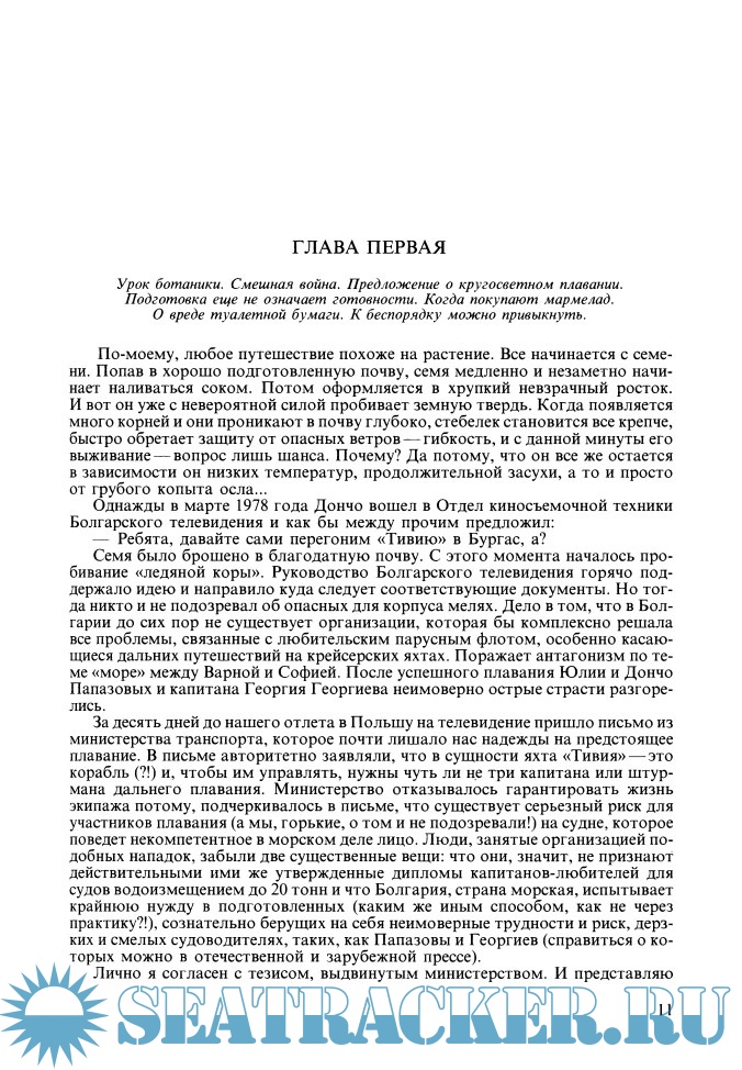 Описание: Известные болгарские путешественники Ю. Папазова и Д. Папазов рассказывают о своем кругосветном плавании на яхте «Тивия». В книге описывается также тренировочное плавание вокруг Западной Европы (из Польши, где была построена яхта, в Болгарию), предшествовавшее кругосветному путешествию (это часть книги написана С. Идакиевым)