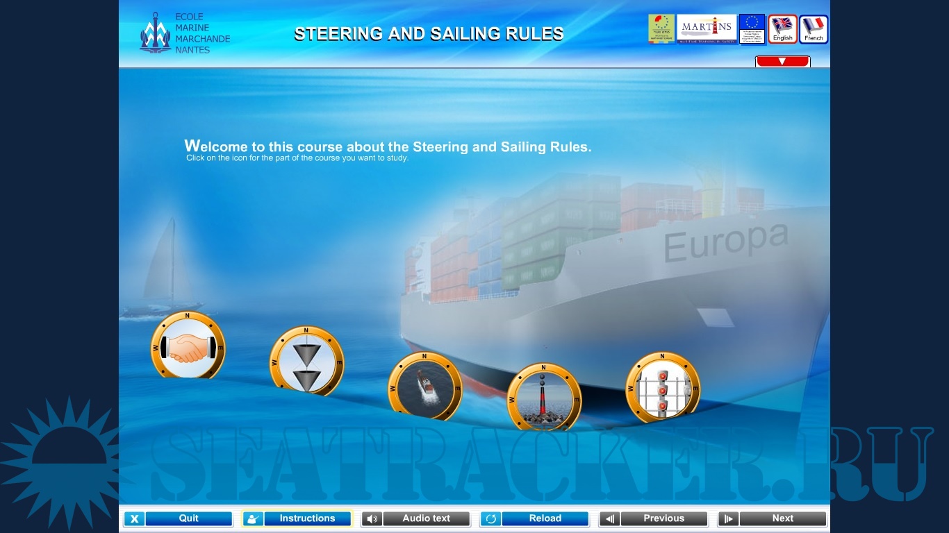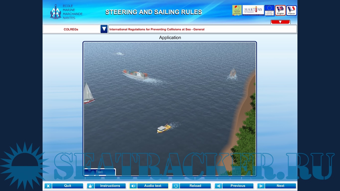 Description: This is a training program for learning of : COLREGs,Port traffic signals,IALA buoyage system and International visual storm warning signals. In COLREGs section you can find all rules represented in well made animations,sounds and description. In the end of each rule u have to answer a few questions.