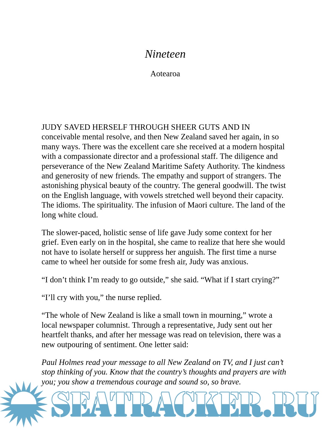 After forty-four hours in the icy water clinging to an overturned dinghy, her back broken and paralyzed below the waist, Judith miraculously survived, winding up in a small community on the New Zealand coast. Gripping, unbelievable yet true, Judith's story of courage, survival, and retribution is alternately heartrending and uplifting. It's also a story of unbreakable bonds, of shattering loss, and of one woman reborn through the strength of friendship and the profound love of strangers who became family.