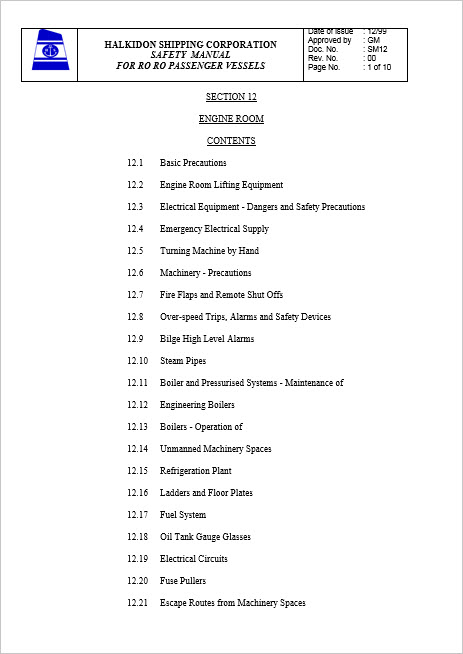 12.1 Basic Precautions 12.2 Engine Room Lifting Equipment 12.3 Electrical Equipment Dangers and Safety Precautions 12.4 Emergency Electrical Supply 12.5 Turning Machine by Hand 12.6 Machinery Precautions 12.7 Fire Flaps and Remote Shut Offs 12.8 Over speed Trips, Alarms and Safety Devices 12.9 Bilge High Level Alarms 12.10 Steam Pipes 12.11 Boiler and Pressurised Systems Maintenance of 12.12 Engineering Boilers 12.13 Boilers Operation of 12.14 Unmanned Machinery Spaces 12.15 Refrigeration Plant 12.16 Ladders and Floor Plates 12.17 Fuel System 12.18 Oil Tank Gauge Glasses 12.19 Electrical Circuits 12.20 Fuse Pullers 12.21 Escape Routes from Machinery Spaces 12.22 Soot Blowing 12.23 Engine Room Pollution Precautions & Procedures