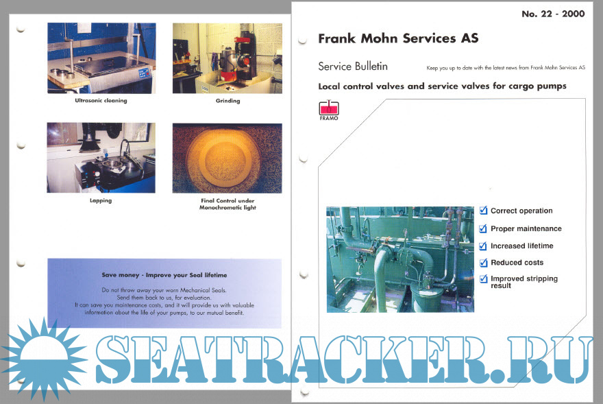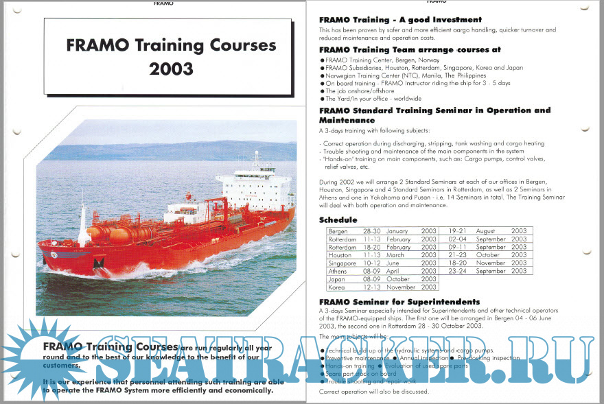 Year: 2003 Language: english Author: Frank Mohn Services AS Genre: Training Courses Publisher: Frank Mohn Services AS Format: PDF Quality: Scanned pages Number of pages: 157 Description: FRAMO Training Courses 2003 FRAMO Training Courses are run regularly all year round and to the best of our knowledge to the benefit of our customers. It is our experience that personnel attending such training are able to operate the FRAMO System more efficiently and economically. FRAMO Training - A good Investment This has been proven by safer and more efficient cargo handling, quicker turnover and reduced maintenance and operation costs. FRAMO Training Team arrange courses at • FRAMO Training Center, Bergen, Norway • FRAMO Subsidiaries, Houston, Rotterdam, Singapore, Korea and Japan • Norwegian Training Center (NTC), Manila, The Philippines • On board training - FRAMO Instructor riding the ship for 3 - 5 days • The job onshore/offshore • The Yard/In your office - worldwide FRAMO Standard Training Seminar in Operation and Maintenance A 3-days training with following subjects: - Correct operation during discharging, stripping, tank washing and cargo heating - Trouble shooting and maintenance of the main components in the system - "Hands-on" training on main components, such as: Cargo pumps, control valves, relief valves, etc. During 2002 we will arrange 2 Standard Seminars at each of our offices in Bergen, Houston, Singapore and 4 Standard Seminars in Rotterdam, as well as 2 Seminars in Athens and one in Yokohama and Pusan - i.e. 14 Seminars in total. The Training Seminar will deal with both operation and maintenance. FRAMO Seminar lor Superintendents A 3-days Seminar especially intended for Superintendents and other technical operators of the FRAMO-equipped ships. The first one will be arranged in Bergen 04 - 06 June 2003, the second one in Rotterdam 28 - 30 October 2003. The main subjects will be: • Technical build-up of the hydraulic systems and cargo pumps. • Preventive maintenance • Annual inspection* Pre-docking inspection • Hands-on training • Evaluation of used spare parts • Spare part stock on board • Trouble shooting and repair work Correct operation will also be discussed.